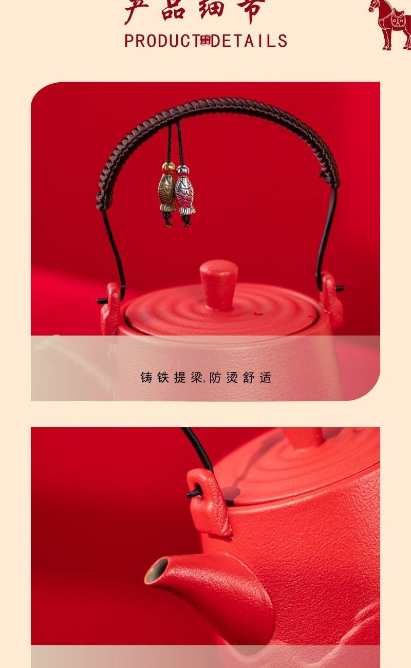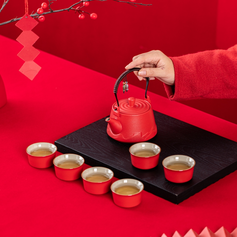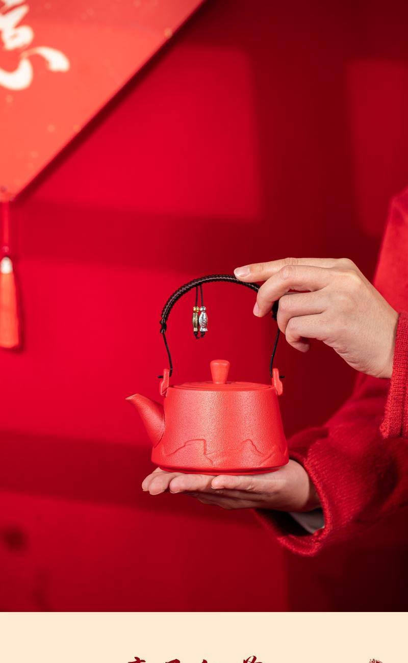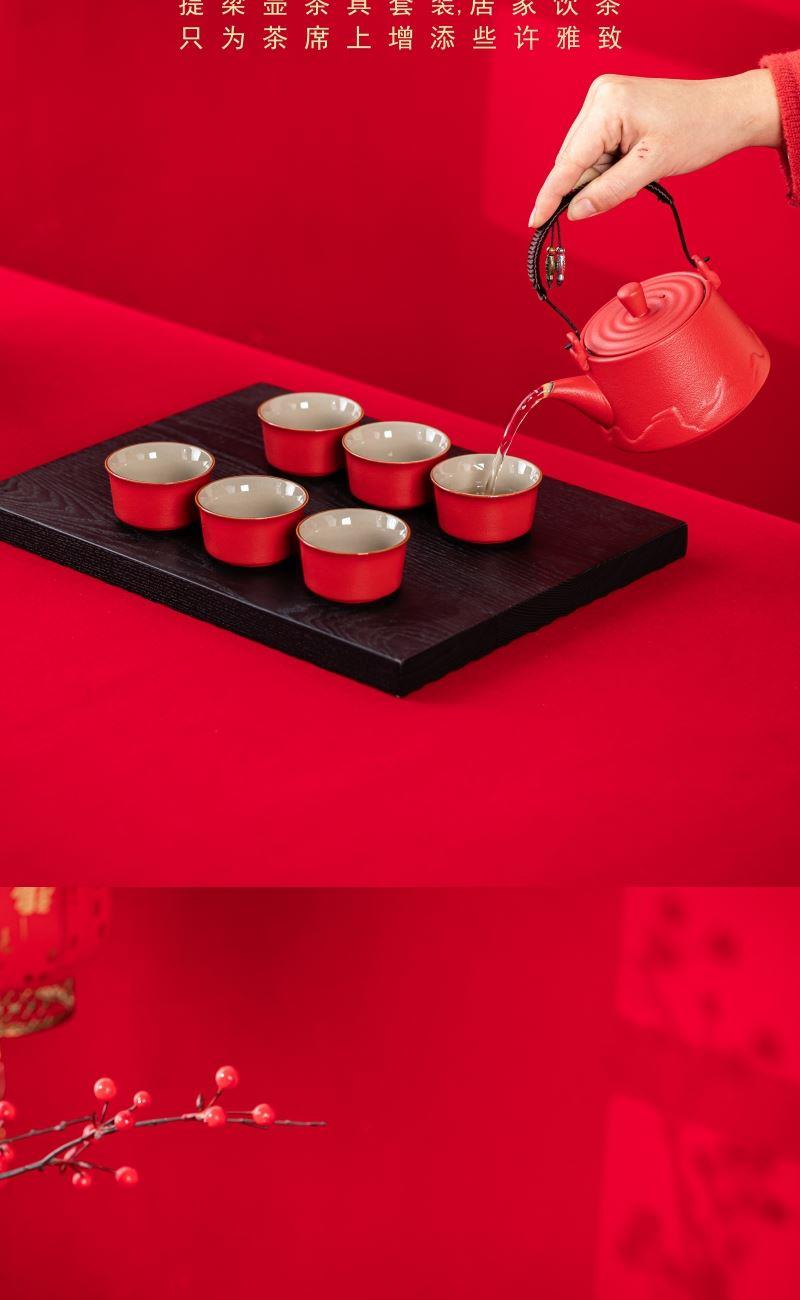 产品型号:JMSF-SW007 产品材质:陶瓷 产品颜色:红色 产品配置:提梁壶x1、品茗杯x6、礼盒礼袋x1 产品规格:提梁壶长110口径75高80mm容量230ml、品茗杯30ml 产品毛重:1.40kg 包装数量:20套 包装尺寸:280*180*115mm 外箱尺寸:58*38*61cm 产品特点: 1、红釉提梁壶+六茶杯,质感拉满; 2、提梁壶泡茶仪式感直接拉满; 3、红金礼盒,颜值与排面并存; 4、自用送礼,把福气送到位。