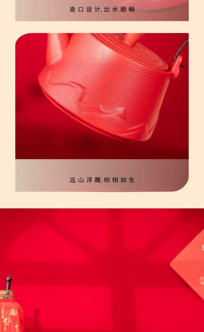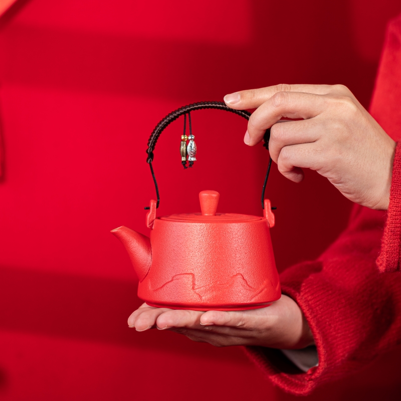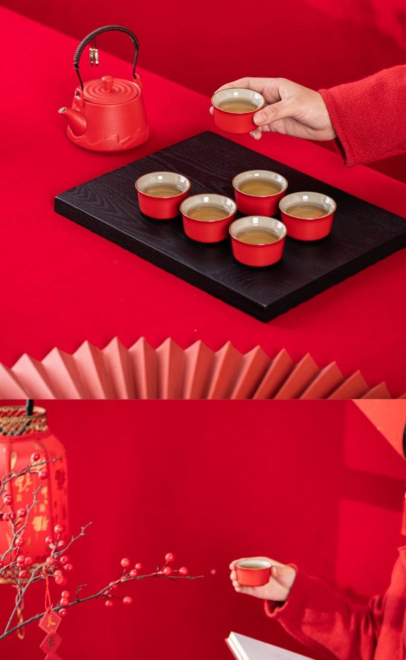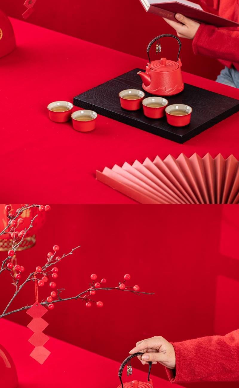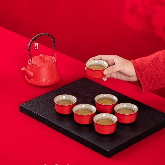 产品型号:JMSF-SW007 产品材质:陶瓷 产品颜色:红色 产品配置:提梁壶x1、品茗杯x6、礼盒礼袋x1 产品规格:提梁壶长110口径75高80mm容量230ml、品茗杯30ml 产品毛重:1.40kg 包装数量:20套 包装尺寸:280*180*115mm 外箱尺寸:58*38*61cm 产品特点: 1、红釉提梁壶+六茶杯,质感拉满; 2、提梁壶泡茶仪式感直接拉满; 3、红金礼盒,颜值与排面并存; 4、自用送礼,把福气送到位。