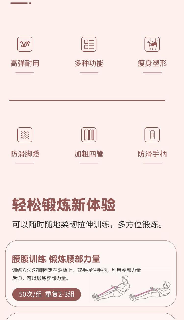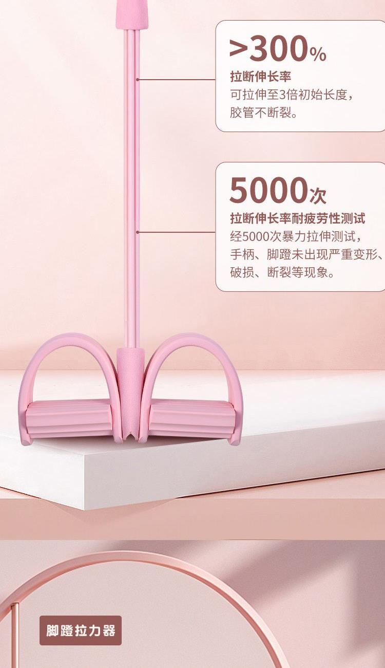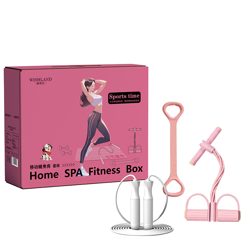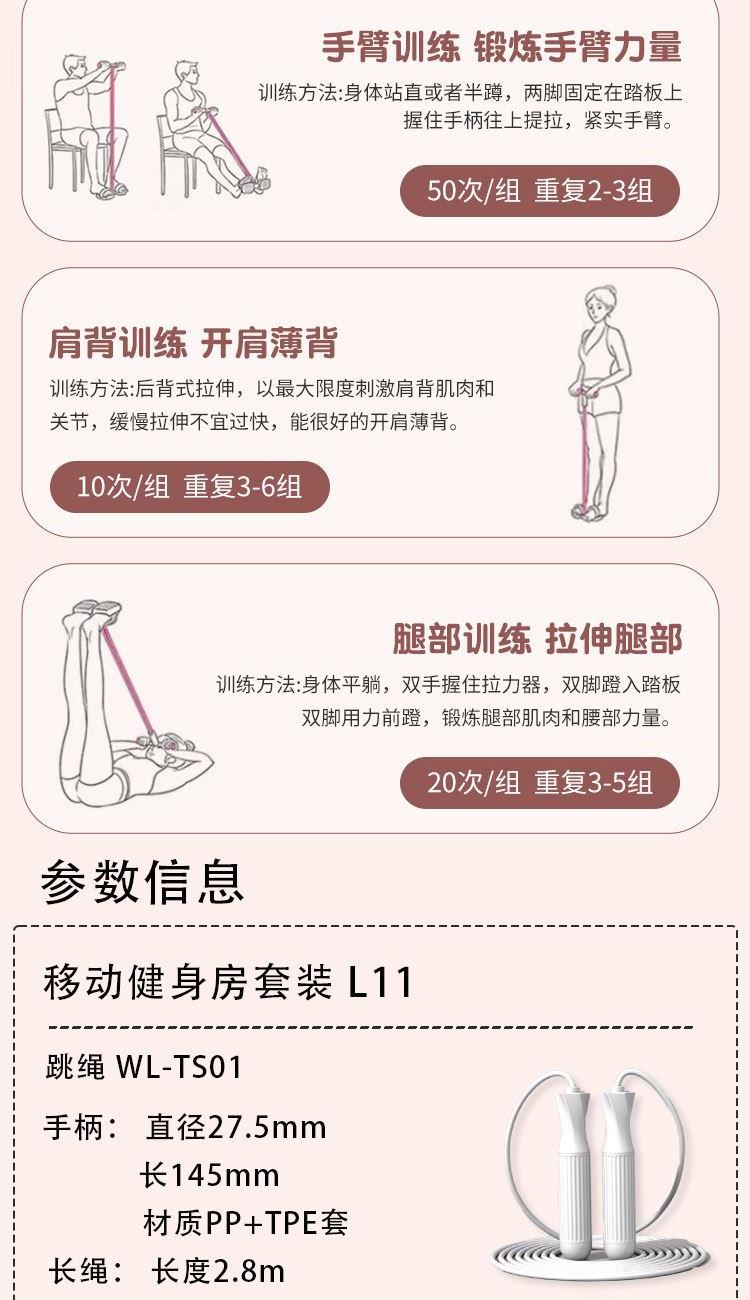 产品配置: 长绳跳绳* 1、足蹬拉力器* 1、拉力带*1、精美礼盒*1 产品规格: 1、跳绳 WL-TS01 手柄:直径27.5mm,长145mm,材质PP+TPE套 长绳:钢丝绳4.5mm±0.2mm,长度2.8m 2、足蹬拉力器 材质:pp+tpe+nbr 颜色:粉色 3、拉力带 材质:TPE+PP 颜色:粉色 产品特点: 1、跳绳加粗钢丝绳体,稳定不漂移,内置调节卡扣,可方便调节绳体长度; 2、多功能脚蹬拉力器,针对性全身锻炼,打造S型曲线;3、4根加粗乳胶管,拉力倍增回弹好,随意拉出恢复如初;4、开肩美背多功能拉力器,高强拉绳,不惧断裂;