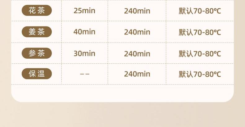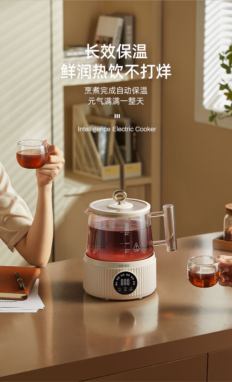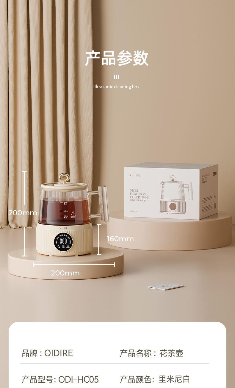 主要材质:PP+高硼硅壶身 电压:220V 功率:600W 容量:800ml 1、800ML容量,适合1-2人使用 2、高硼硅玻璃材质,0水垢易清洗 3、分离式设计,玻璃壶体易清洗 4、4小时持续保温 5、6大功能,满足不同泡茶方式 6、一键触控,操作简单 7、搭配玻璃滤筒,支持分隔煮