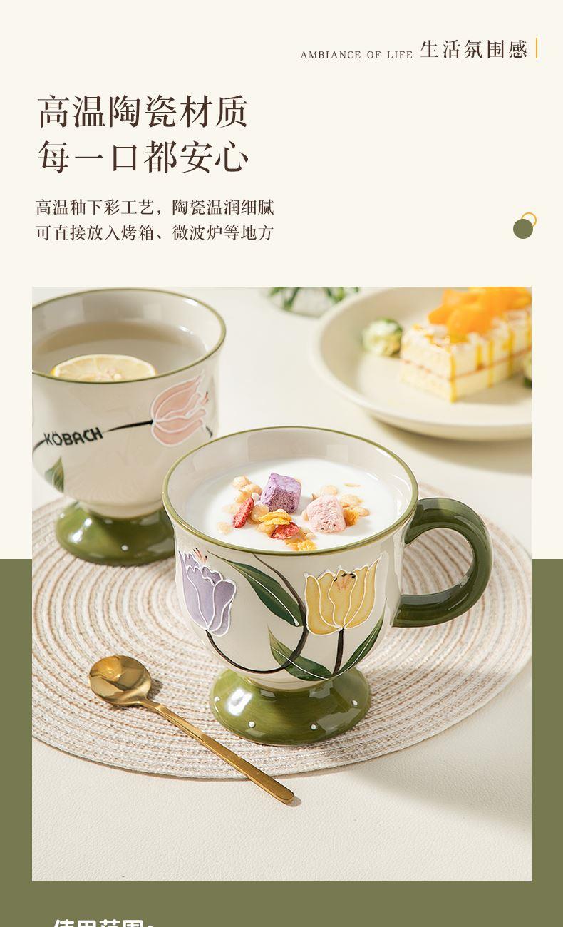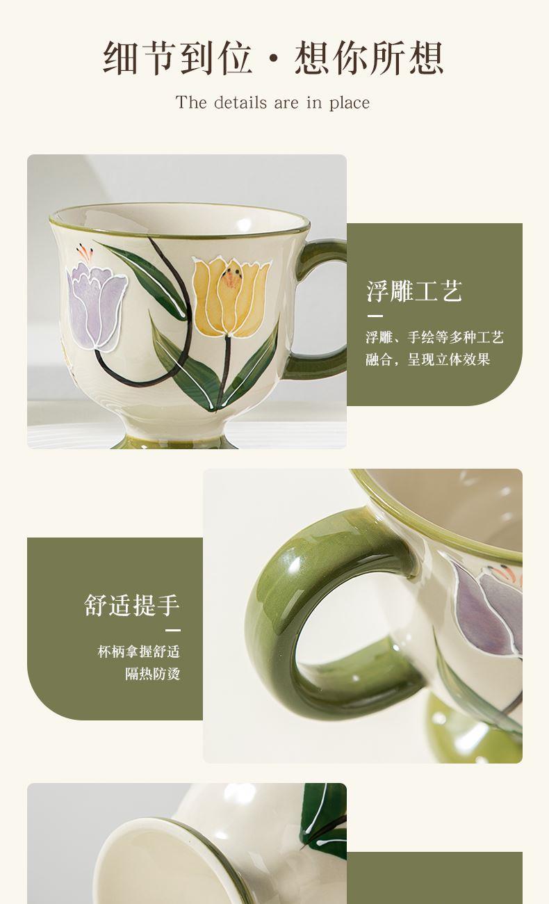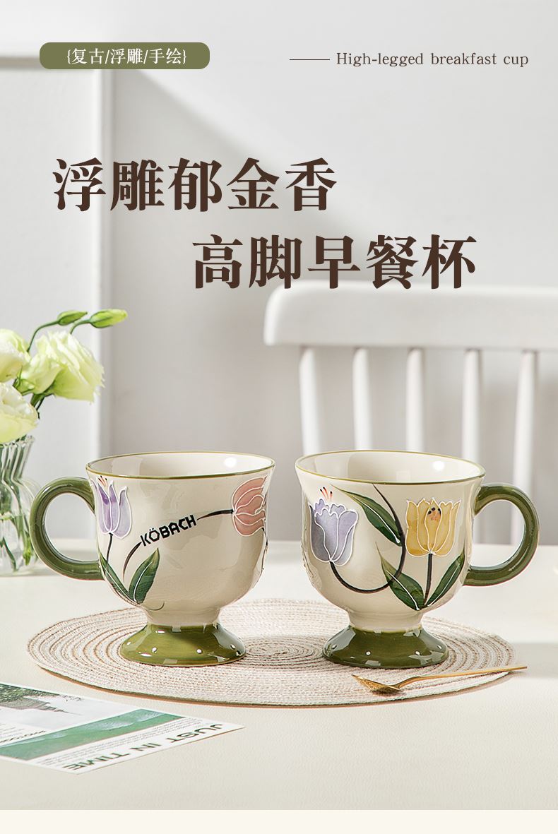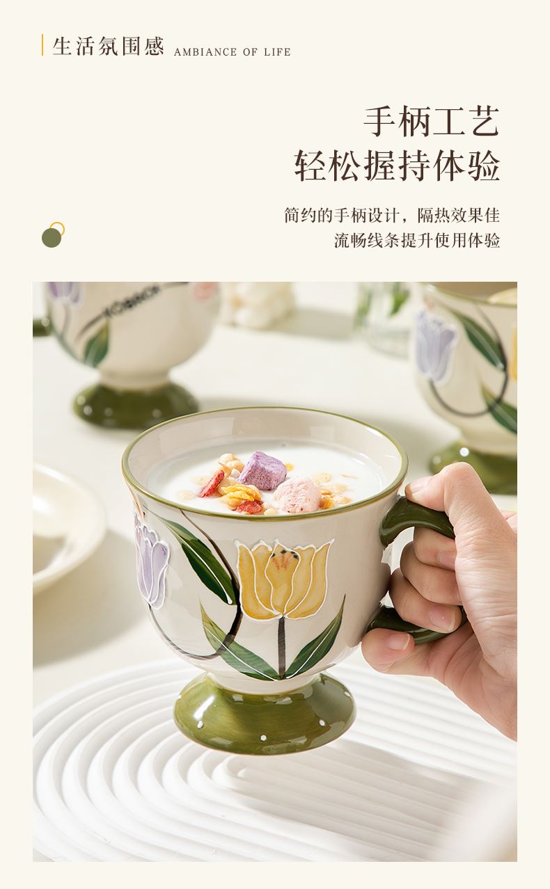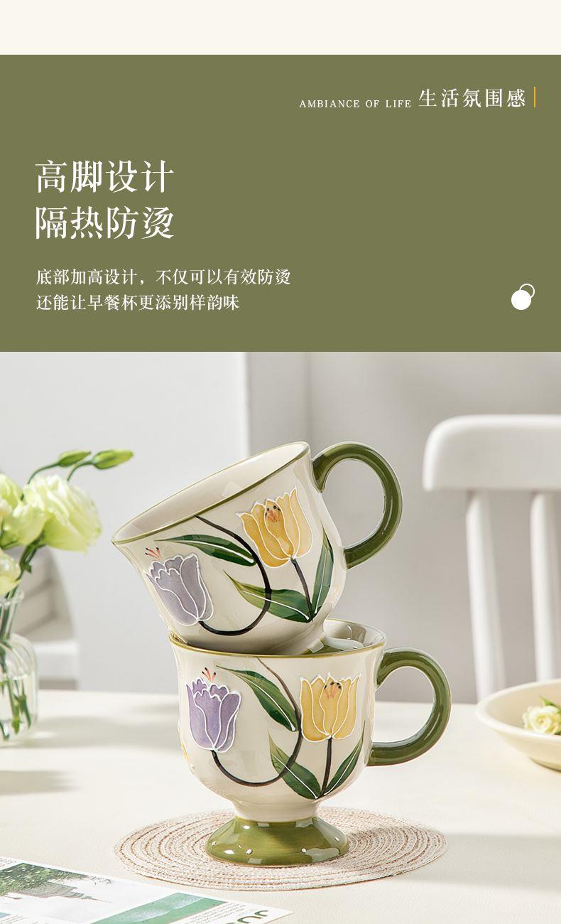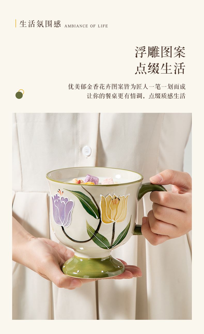 【材质】陶瓷 【规格】500ml 【包装方式】彩盒 【彩盒尺寸】197*160*134mm 【重量】0.8kg 【条码】6957929941478 【配置】500ml早餐杯*1 艺术与实用的结合。杯身以立体浮雕工艺呈现郁金香造型,花瓣纹理细腻,柔和色调,清新雅致,为早餐时光注入浪漫气息,居家 办公,让生活成为一束光,拒绝单调,让您从此爱上喝水 精选优质陶土,高温烧制,可进烤箱、微波炉,洗碗机,釉下花色永不褪色,更健康,使用更安全
