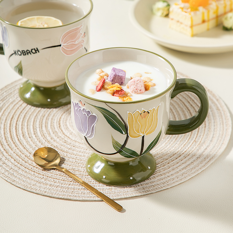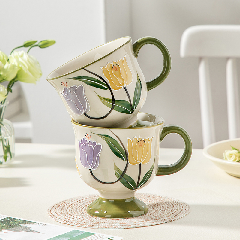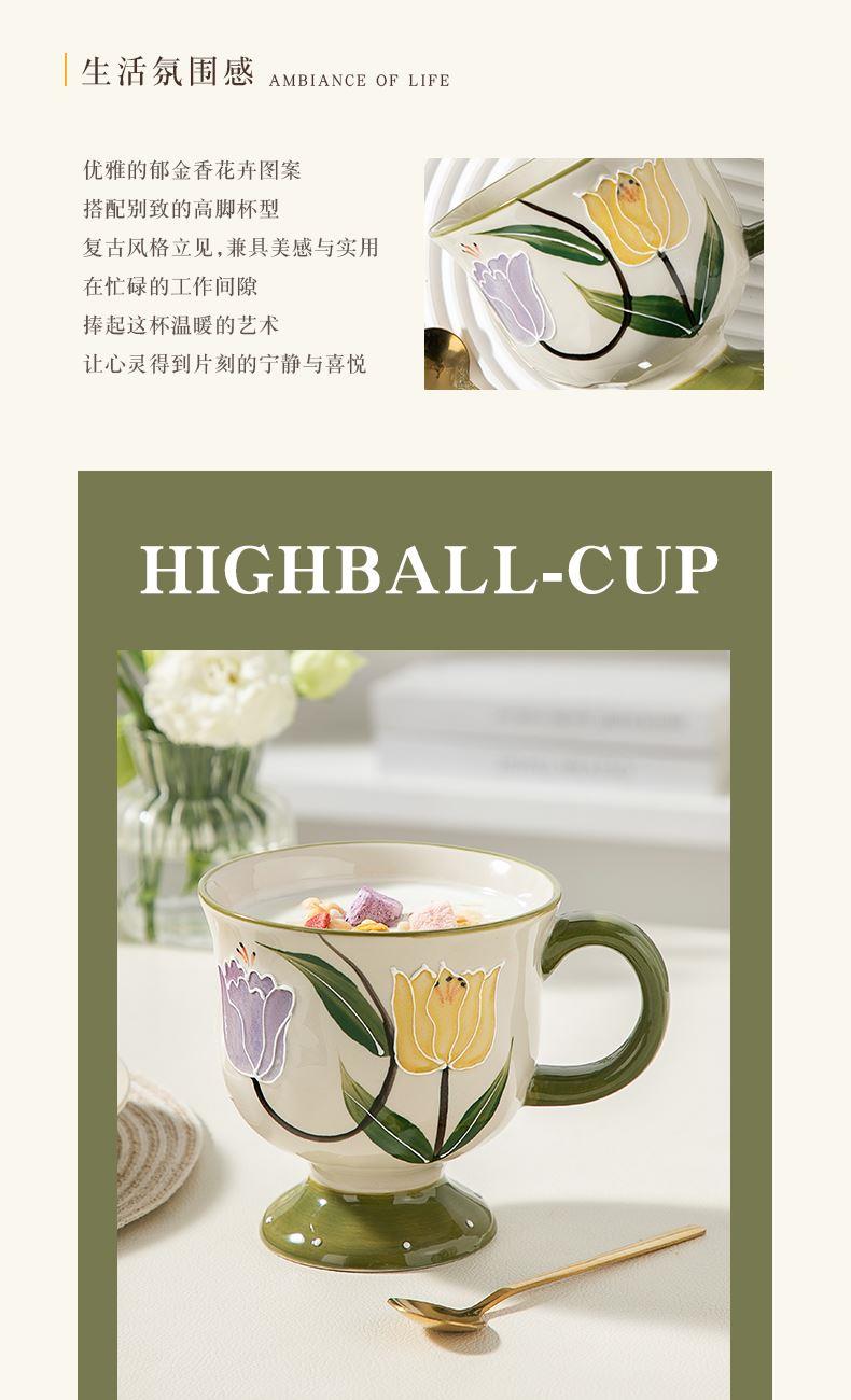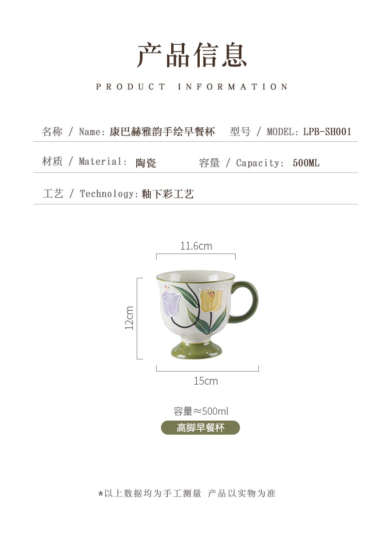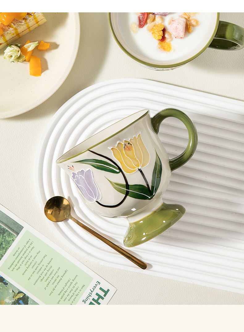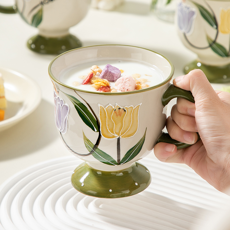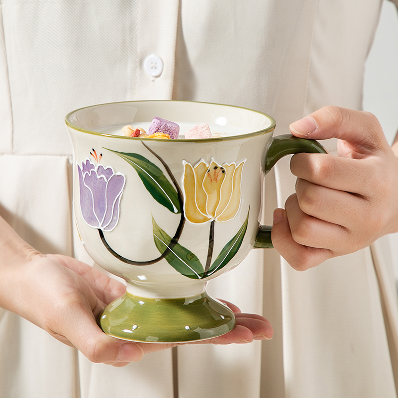 【材质】陶瓷 【规格】500ml 【包装方式】彩盒 【彩盒尺寸】197*160*134mm 【重量】0.8kg 【条码】6957929941478 【配置】500ml早餐杯*1 艺术与实用的结合。杯身以立体浮雕工艺呈现郁金香造型,花瓣纹理细腻,柔和色调,清新雅致,为早餐时光注入浪漫气息,居家 办公,让生活成为一束光,拒绝单调,让您从此爱上喝水 精选优质陶土,高温烧制,可进烤箱、微波炉,洗碗机,釉下花色永不褪色,更健康,使用更安全