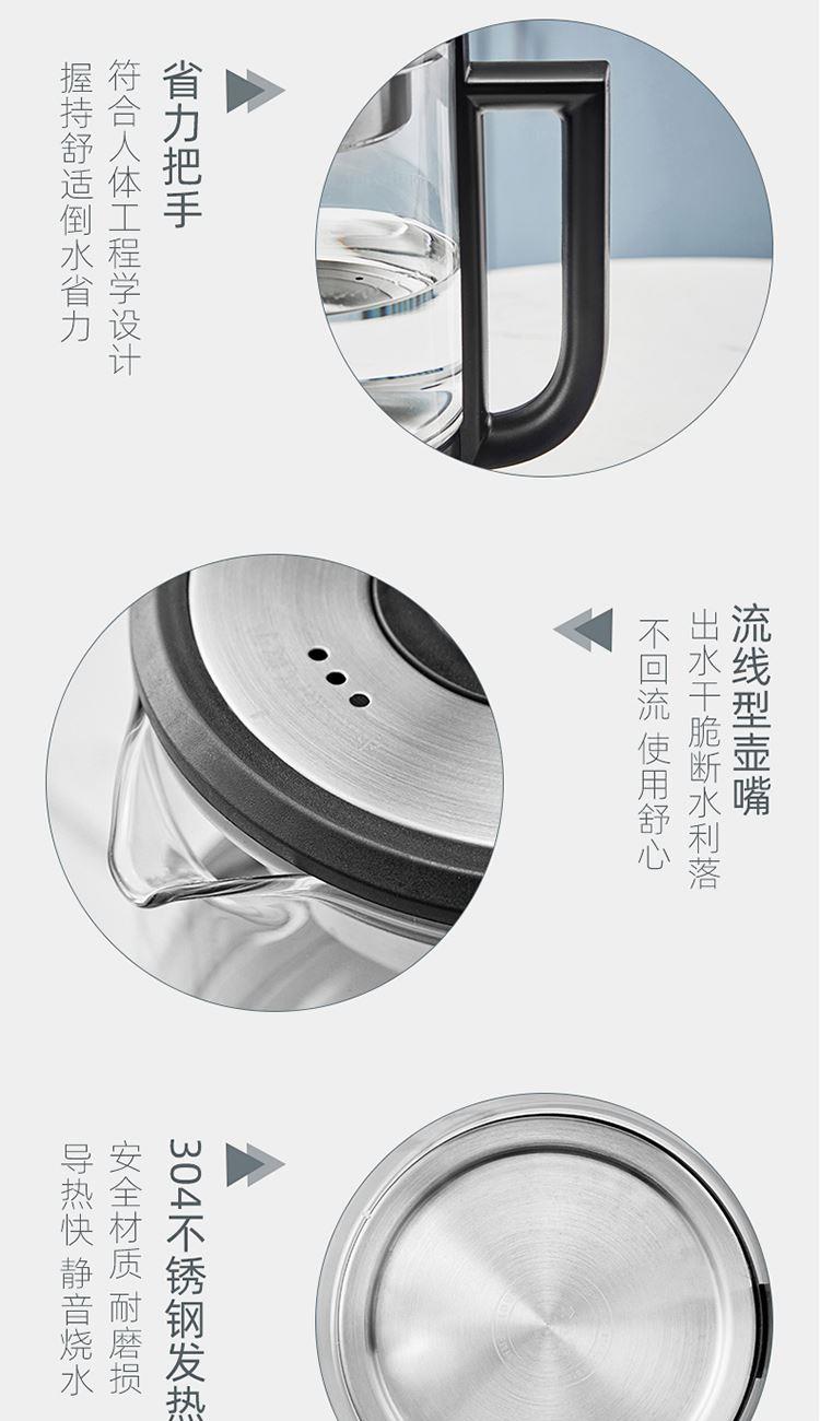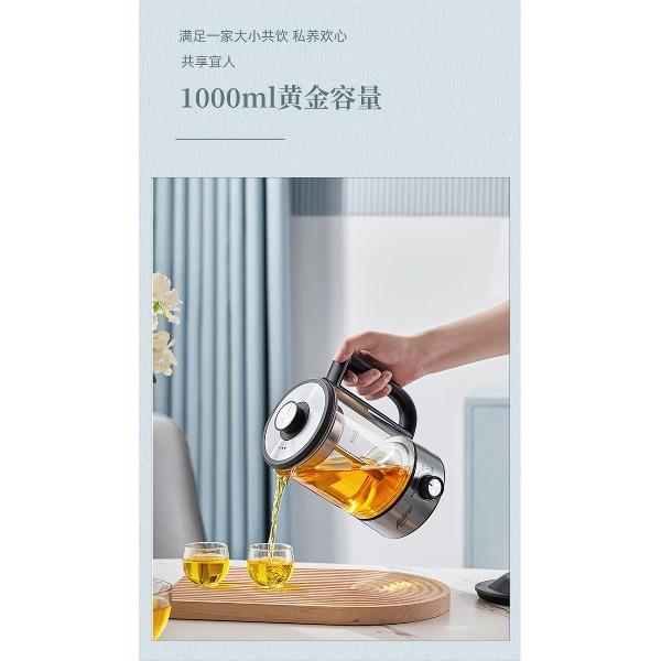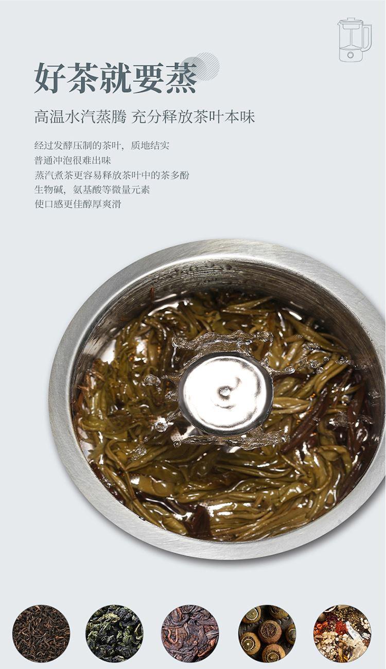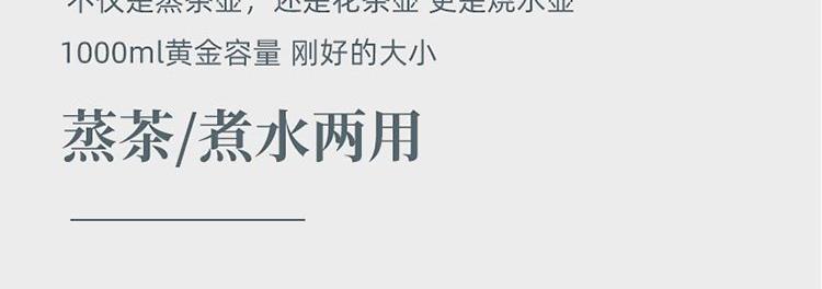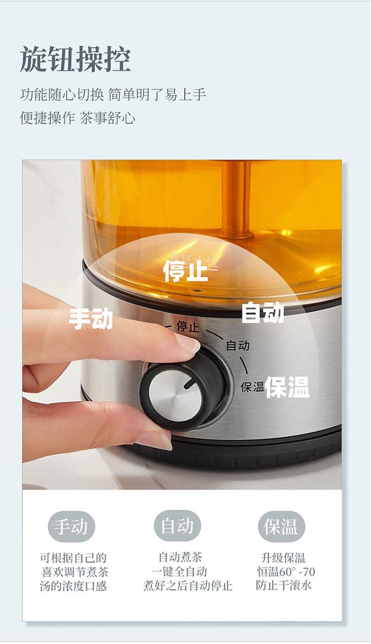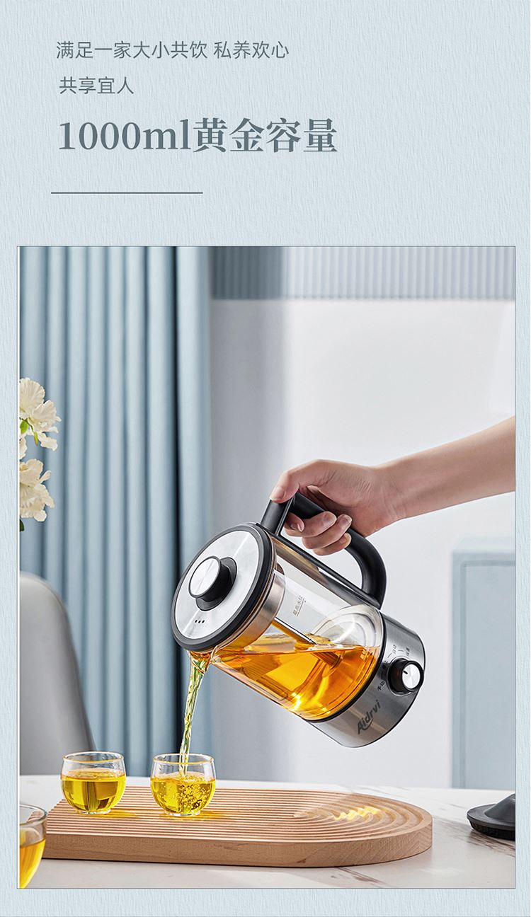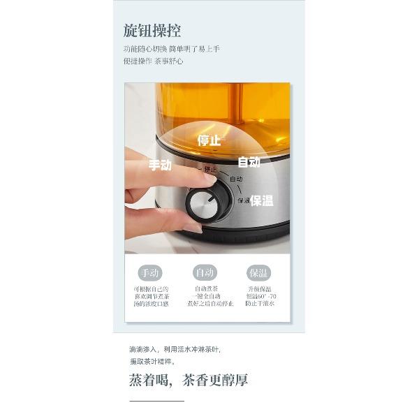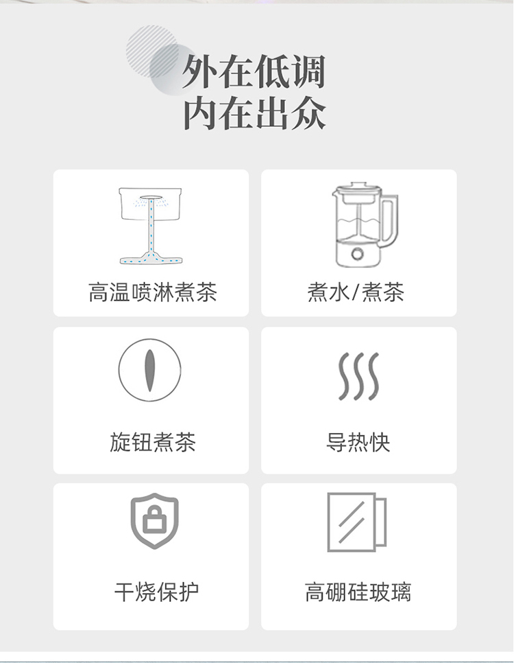 功率:600W/220V/50Hz 容量:1000ML 净重:1.4kg 材质:奥氏体304(主体) / 高硼硅玻璃(壶身) 产品尺寸:230*125*160mm 彩盒尺寸:264*165*283mm 1000ml黄金容量,加配六只茗品杯 食品级接触用材质,安全呵护,健康养生 功能随心切换,便携操作 双模式烹茶,滋养双重奏 高硼硅玻璃,无惧骤冷骤热 食品级304不锈钢发热盘 蒸汽喷淋萃煮,适合发酵茶