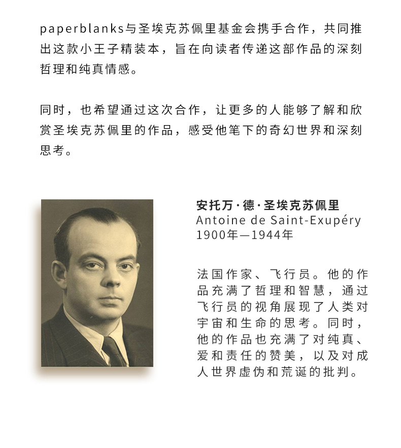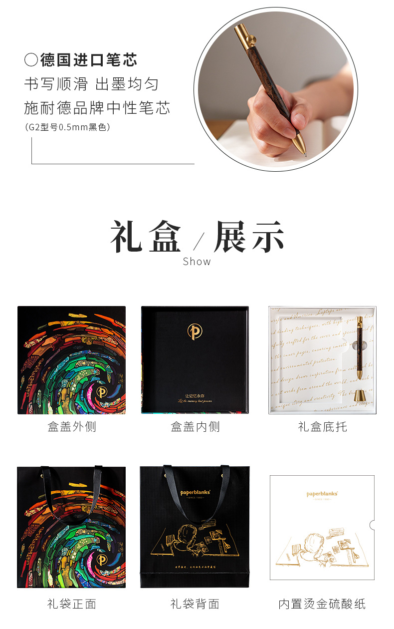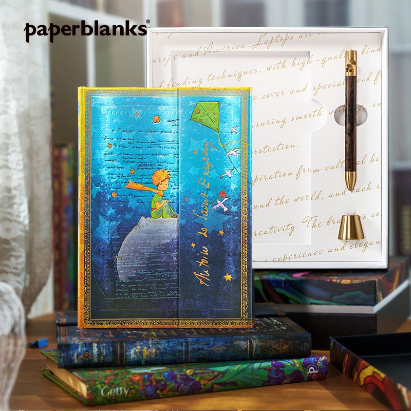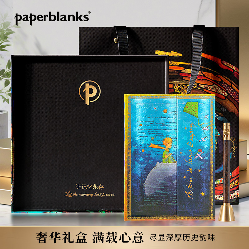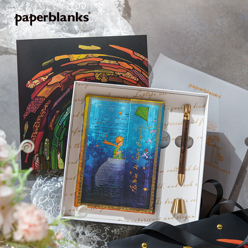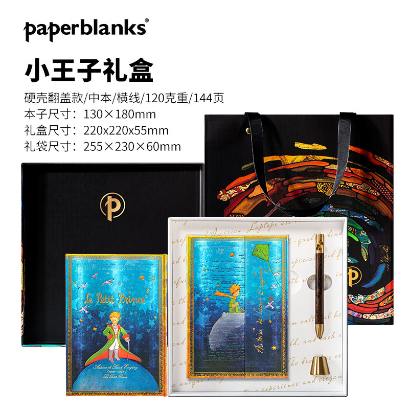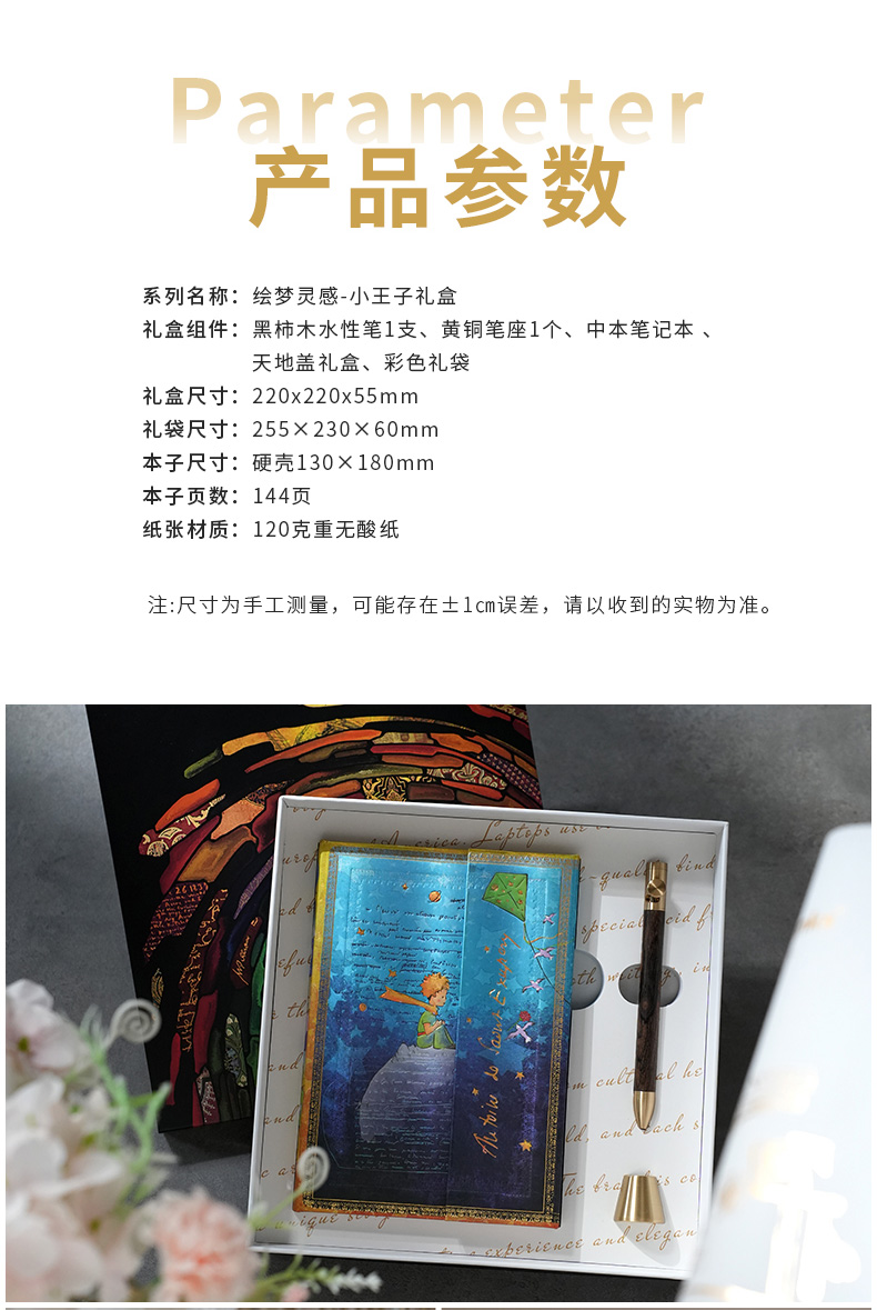 产品:绘梦灵感-小王子礼盒套装 创作灵感:正面手稿来源于圣埃克苏佩里1942年创作的<小王子>一段节选。 笔记本封面选用该作品出版书籍的2副标志性插花作为背景,包括小王子的形象、他所在的星球、玫瑰等。翻盖印有作者签名,增添了艺术气息和收藏价值。目前,该手稿收藏于纽约市摩根图书馆 礼盒组件:黑柿木水性笔1只、黄铜笔座1个、中本笔记本、天地盖礼盒、彩色礼袋 礼盒尺寸:220*220*55mm 礼袋尺寸:255*230*60mm 本子尺寸:130*180mm 本子页数:144页 纸张材质:120克重无酸纸