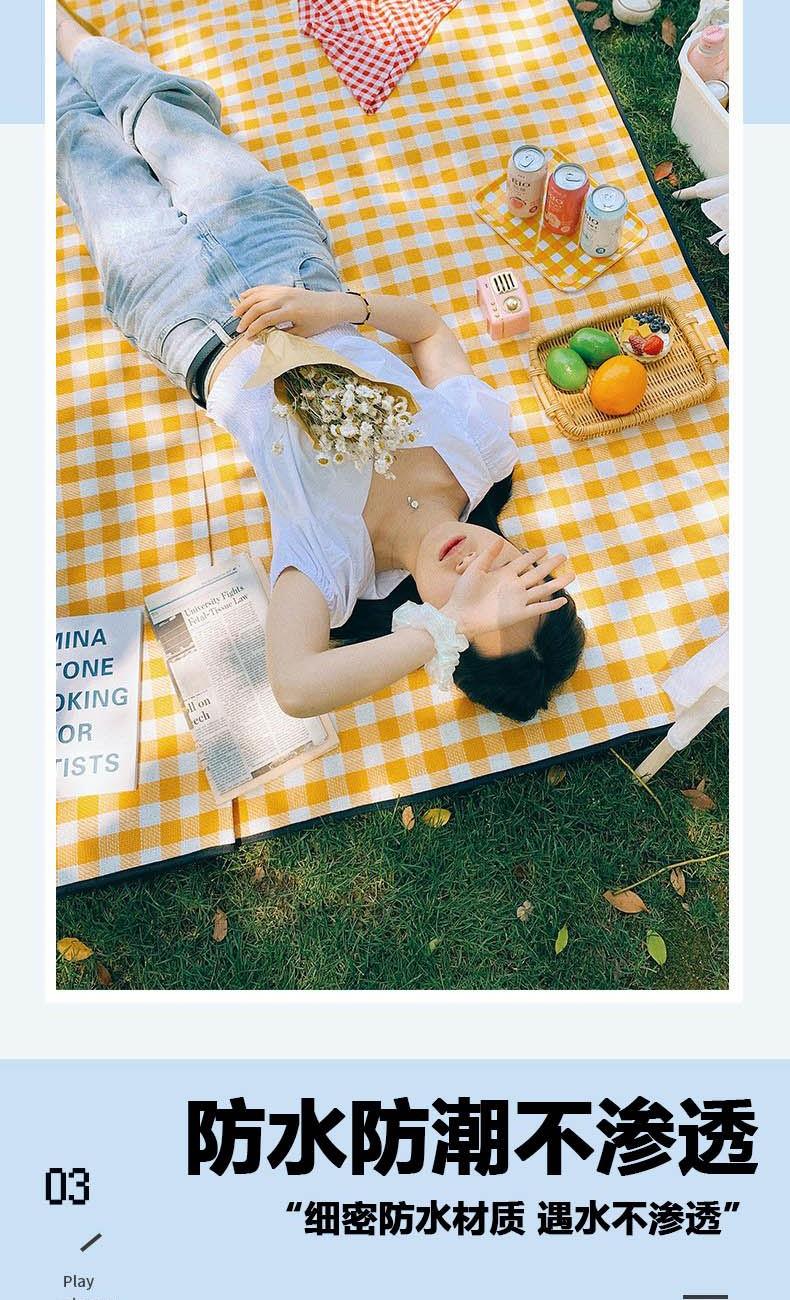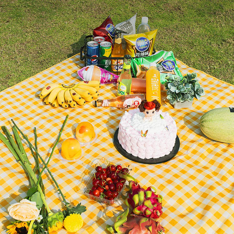 配 置:野餐垫*1 产品颜色:黄色方格 产品材质:600D牛津布 产品尺寸:200*200CM 包 装:OPP袋 产品卖点: 1、便携折叠易收纳。 2、防潮耐磨,小巧便捷,不沾花草