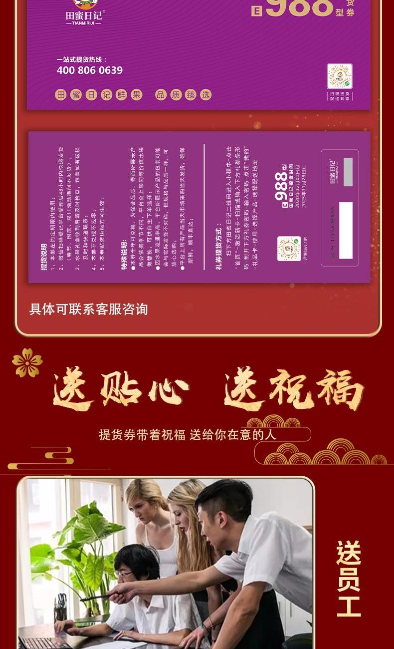 田蜜日记专业给各综合性平台、礼品公司、卡册公司等渠道提供全年水果一件代发及节假日项目集采业务,目前已对接了如:得力、史泰博、齐心等三百多个平台及渠道,整年水果单品丰富,可开专票、可授权、提供京东比价链接、提供主图详情页,同时发行全国通用,全年可自由兑换的田蜜日记水果提货券,全国免费配送到家,长期有效,售后全包