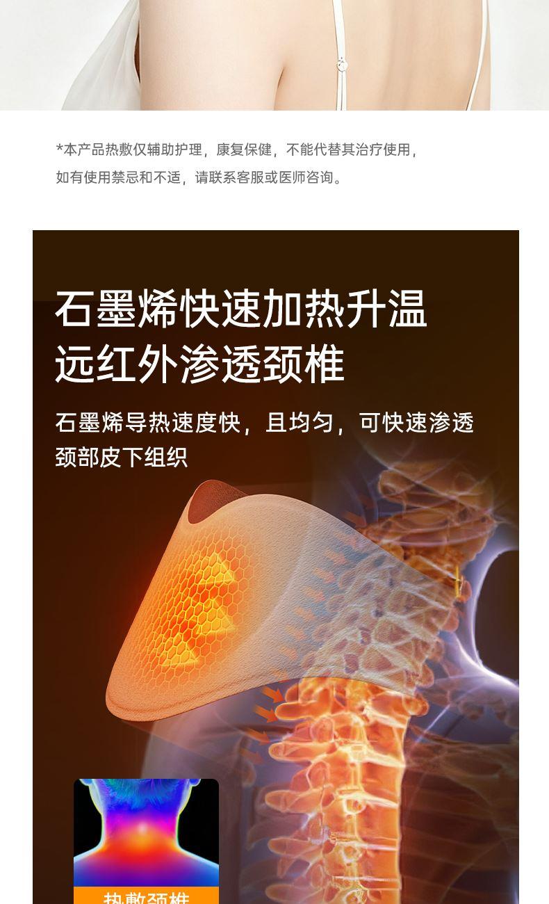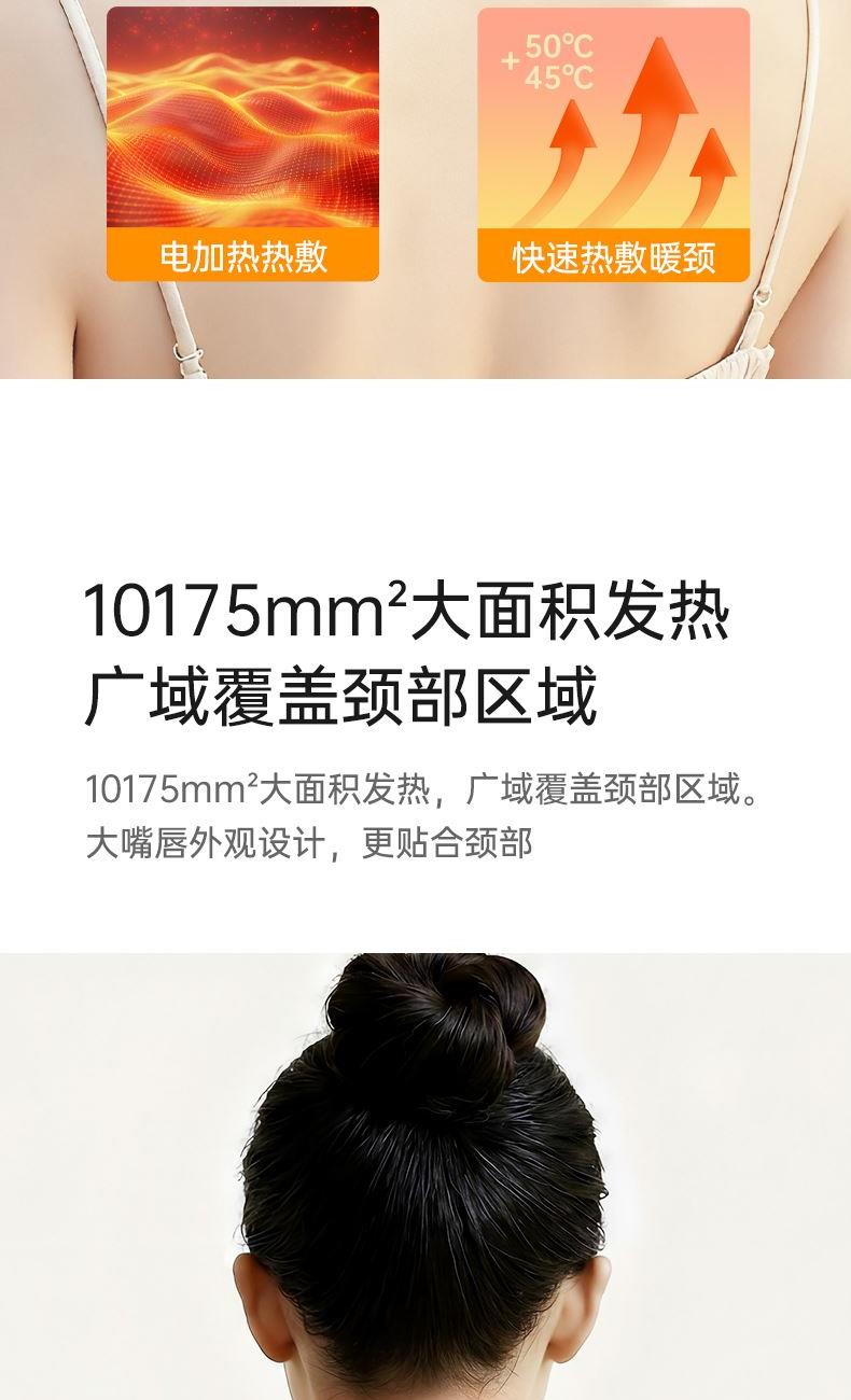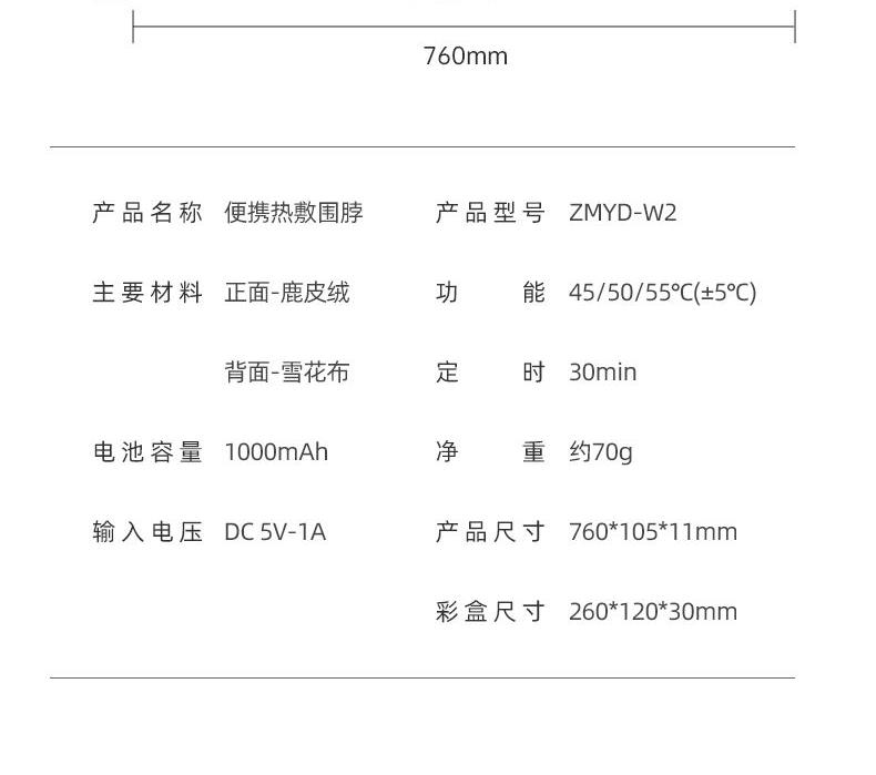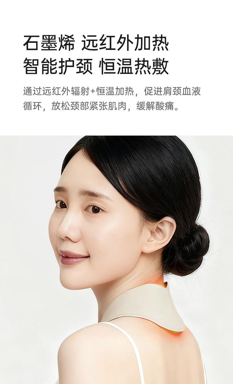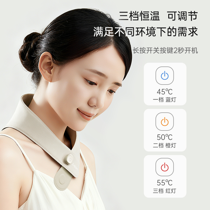 石墨烯恒温均匀加热,45-50-55℃三挡热敷档位,智能温控调节,无惧寒冬; 轻便3色显示,对比市面上带有显示屏,外置电池产品更轻便,长期佩戴没有压迫感。 四季可用,缓解颈部疲劳,唤醒活力; 智能温控,更安全,防止烫伤(温度感知因人而异,请选择合适自己的温度); 1分钟(待定)开机速热,无惧寒冬; 30分钟自动关机,可以是用约2小时。更贴合是用场景,防止忘记关机掉电; 发热膜尺寸185*55mm,发热面积10175mm²,广域覆盖颈部区域,更保暖,放松更多面积肌肉组织; 70g超轻重量,重新定义发热围脖,久戴无压力; 可调节磁吸搭扣,满足各种颈型; 轻便小巧,外出携带不占地; 充电宝也能充电,可以满足在外使用需求; 精心测量,人体线型设计,佩戴更贴合舒适