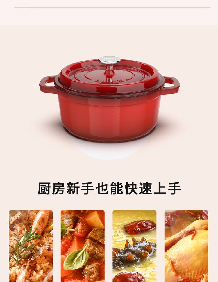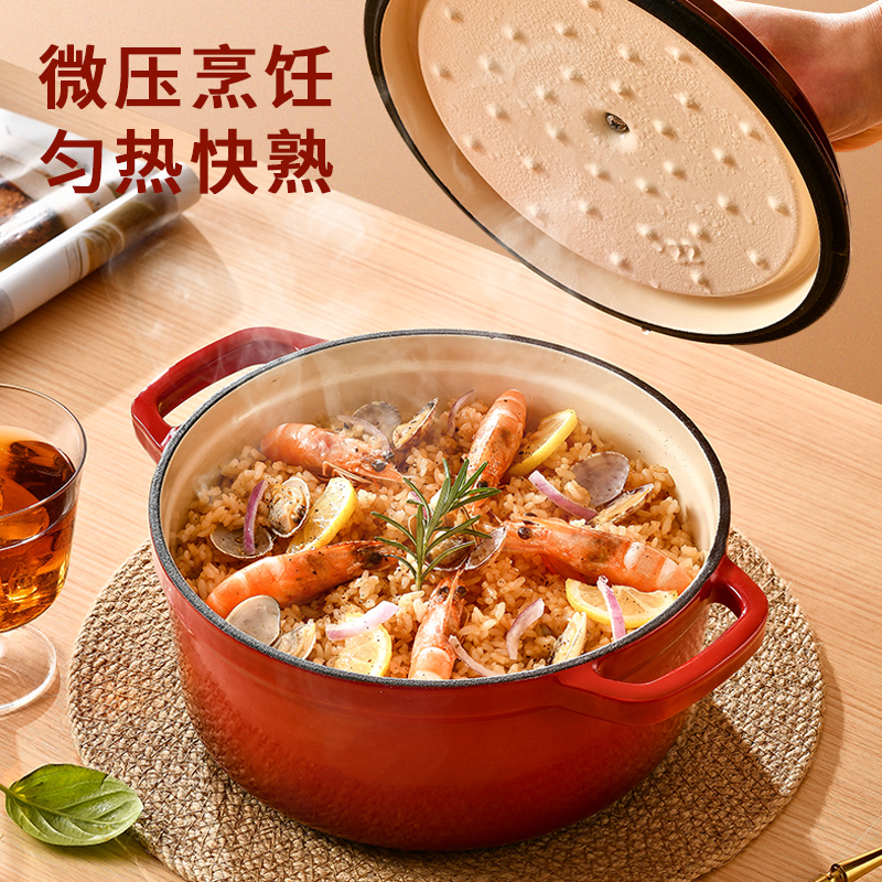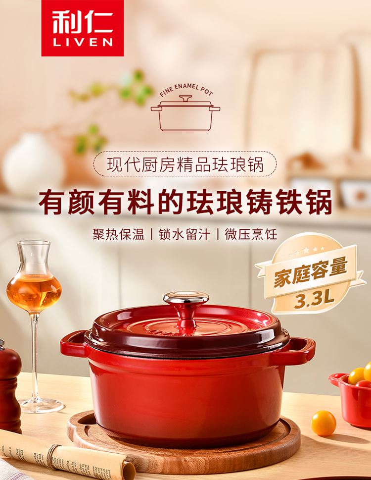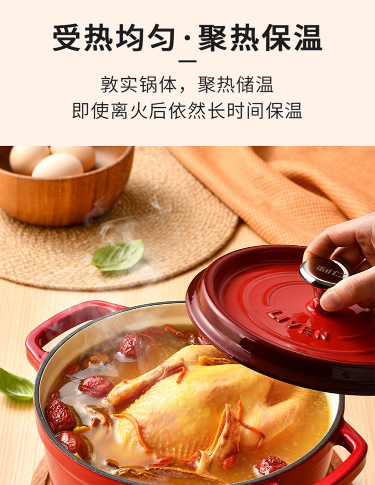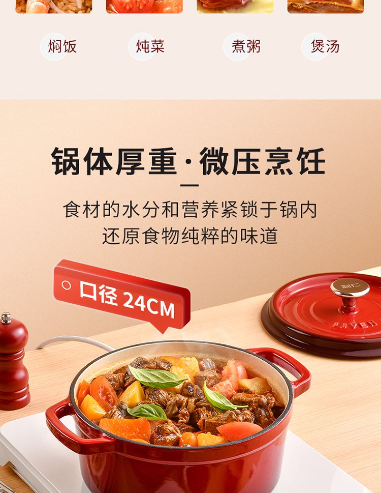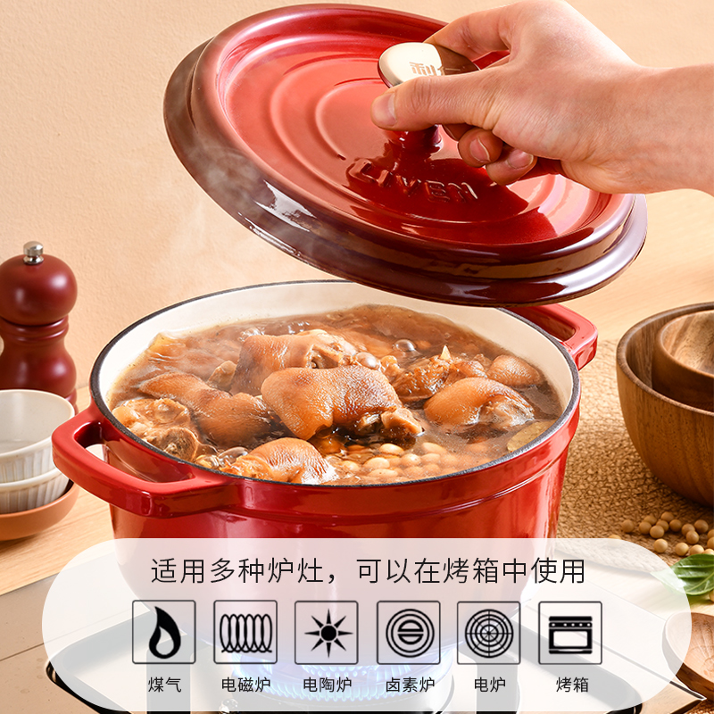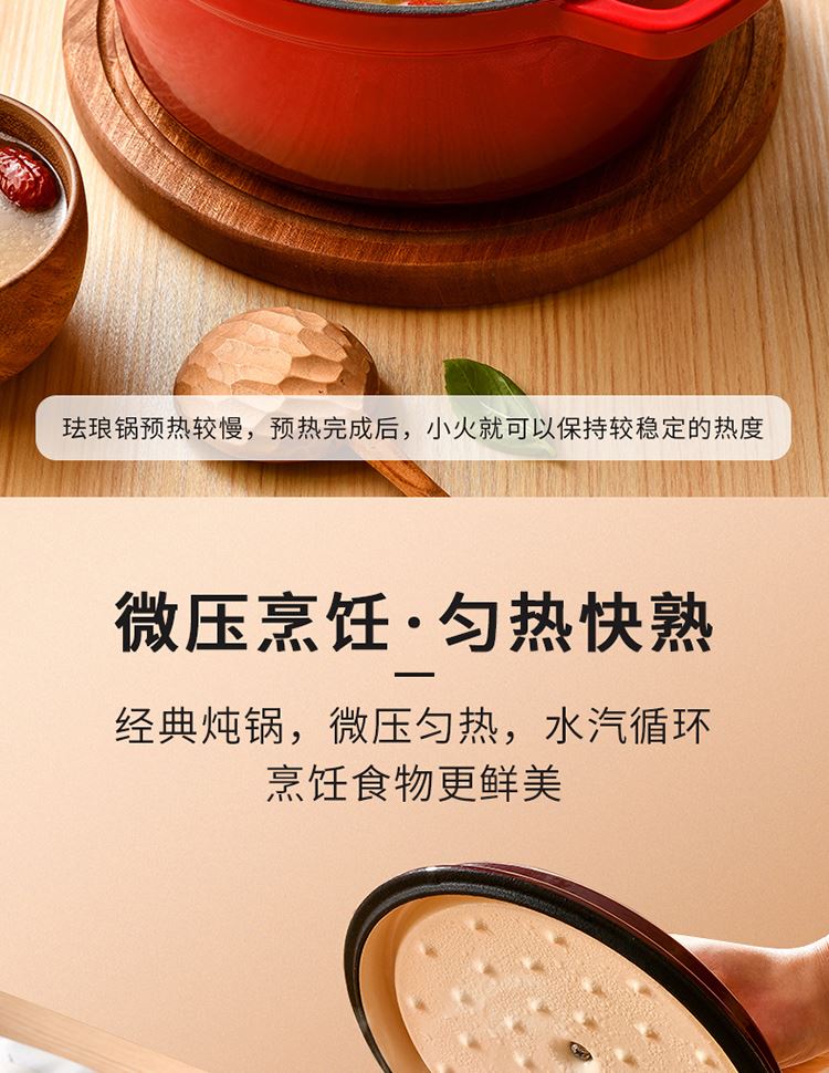 加厚铸铁材质,自循环炖煮 微压烹饪,均匀受热持久保温 3.3L大容量一锅多能 全家共享 高纯度铸铁工艺天然矿石材质 不挑炉灶随心烹饪适合大多数厨房