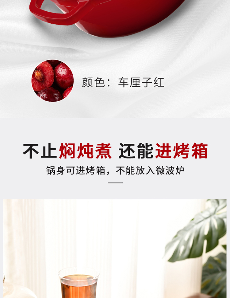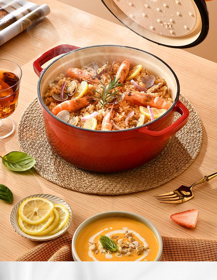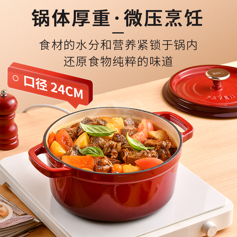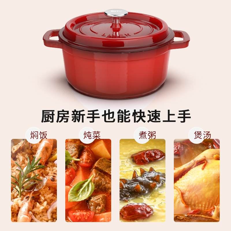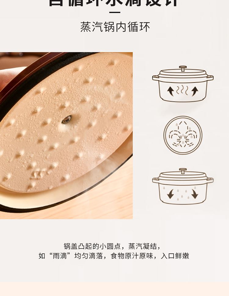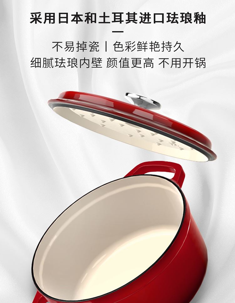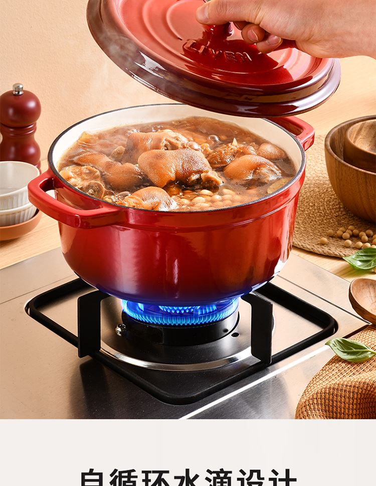 加厚铸铁材质,自循环炖煮 微压烹饪,均匀受热持久保温 3.3L大容量一锅多能 全家共享 高纯度铸铁工艺天然矿石材质 不挑炉灶随心烹饪适合大多数厨房