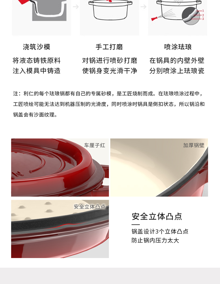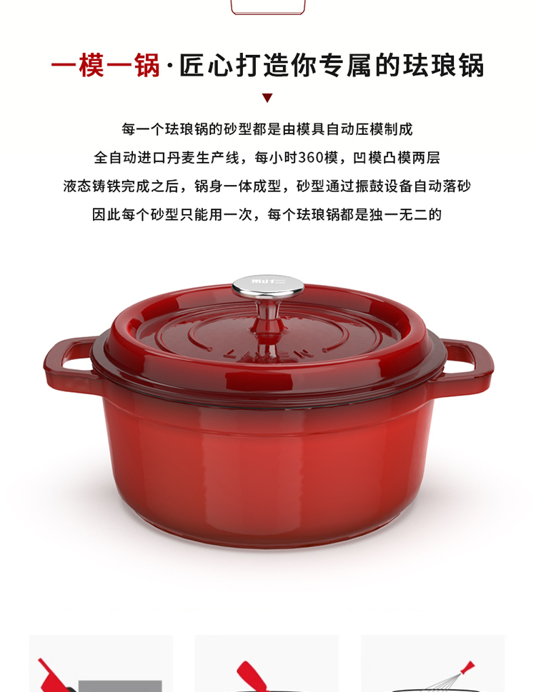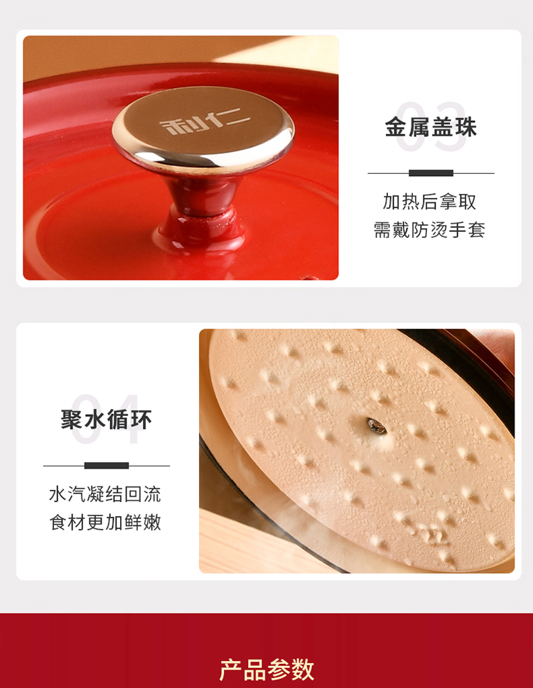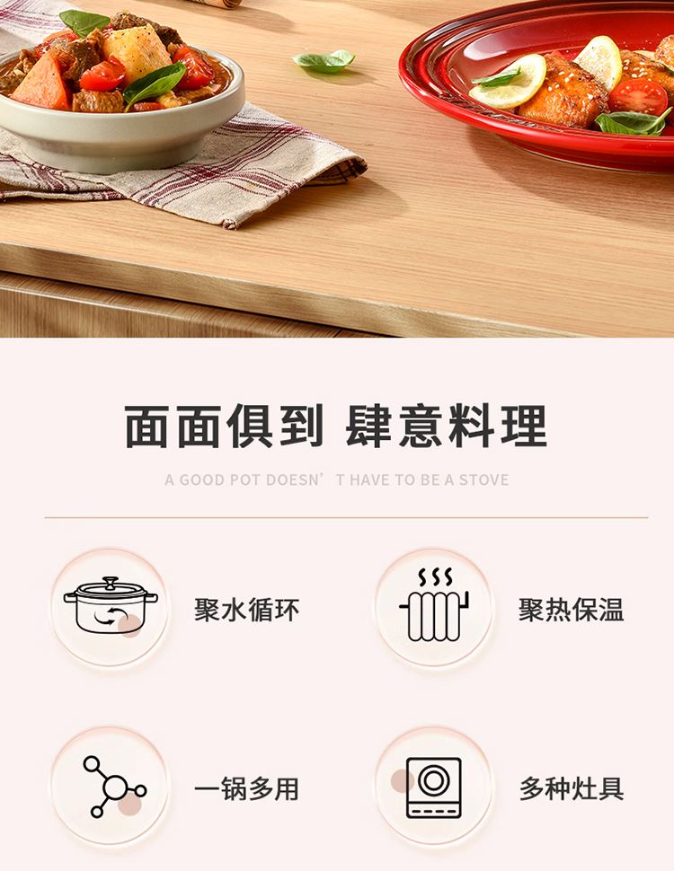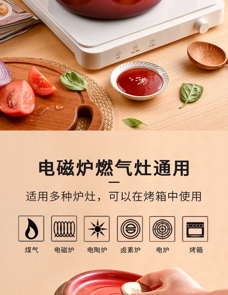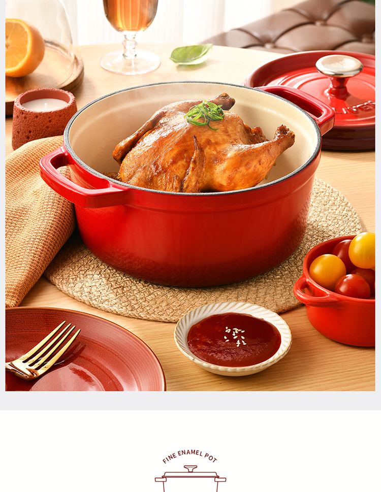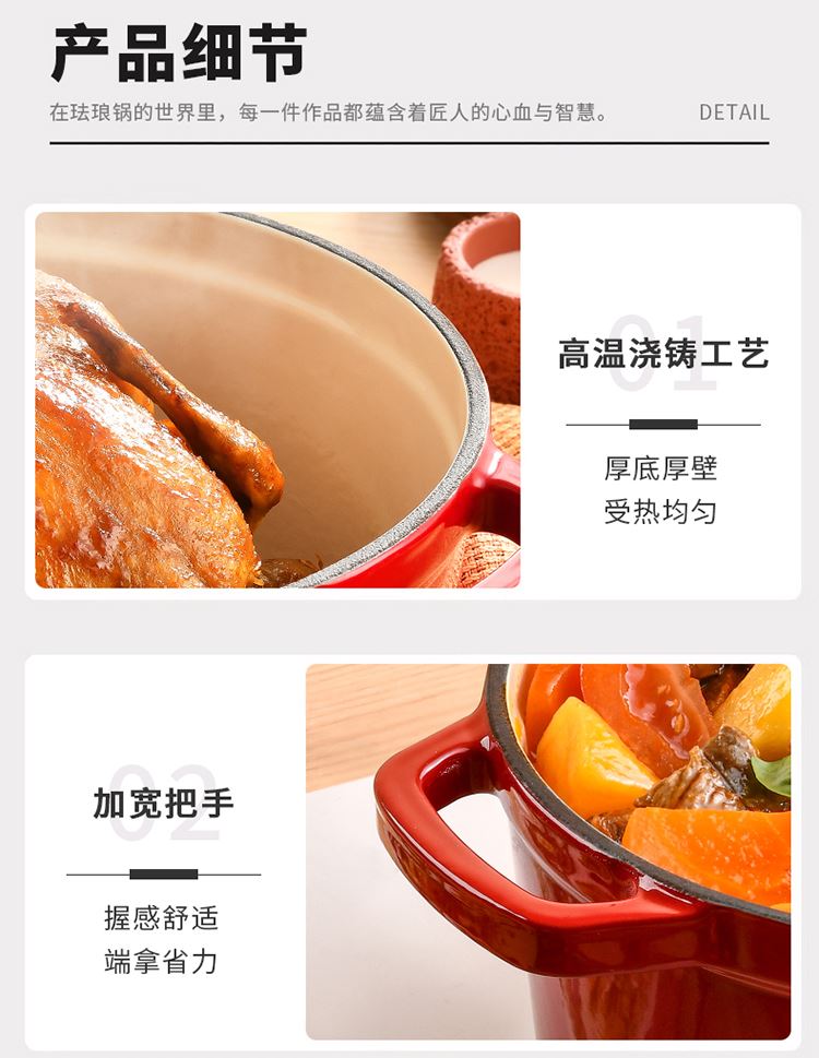 加厚铸铁材质,自循环炖煮 微压烹饪,均匀受热持久保温 3.3L大容量一锅多能 全家共享 高纯度铸铁工艺天然矿石材质 不挑炉灶随心烹饪适合大多数厨房