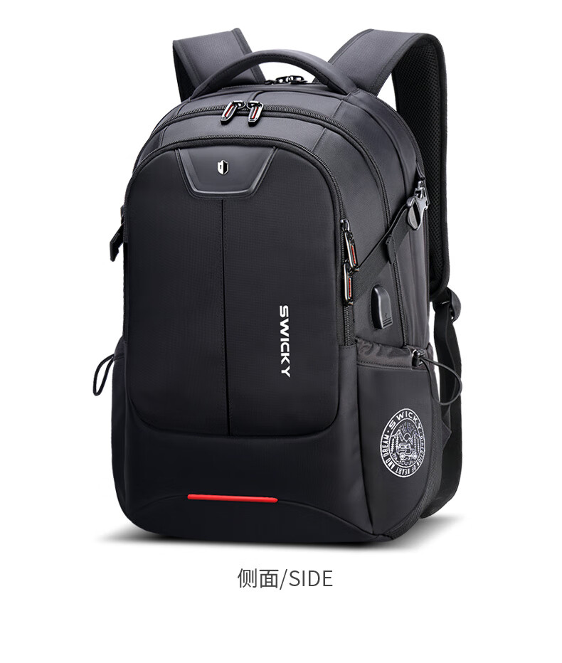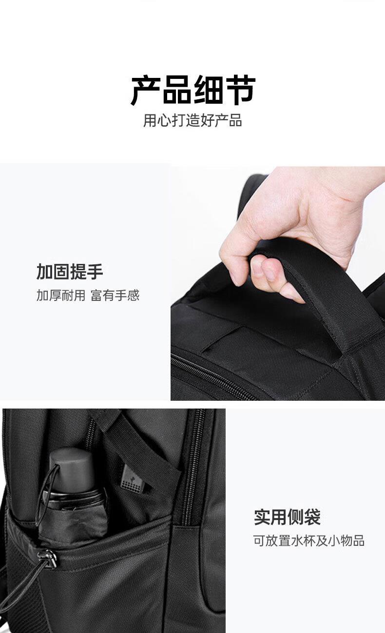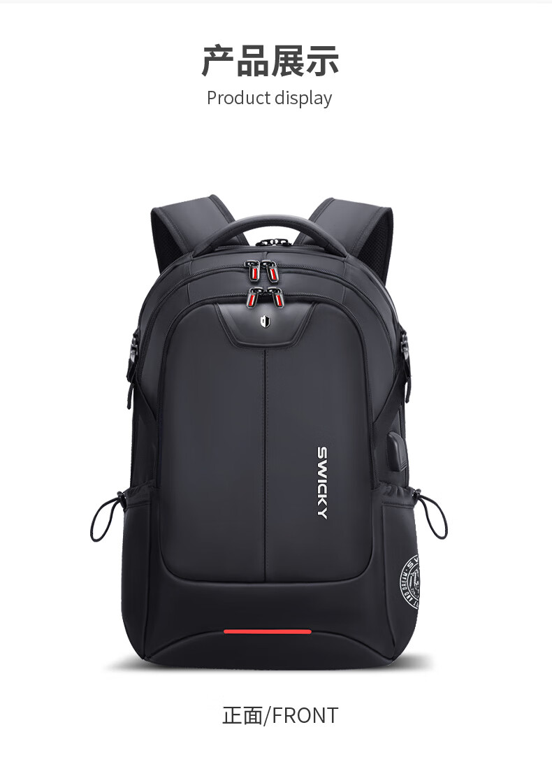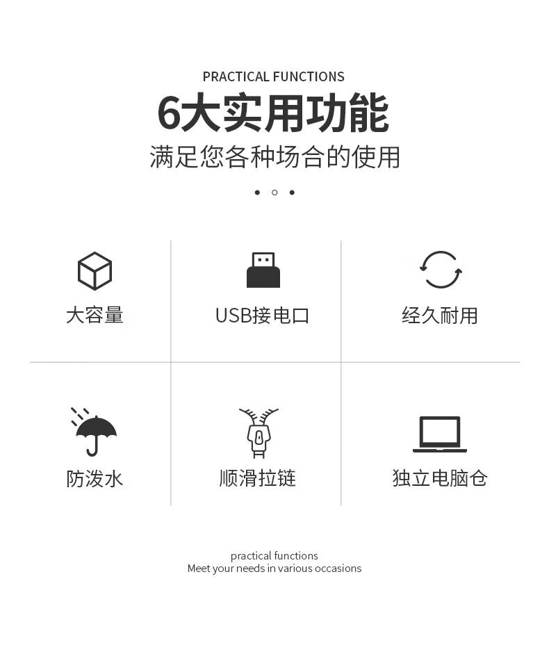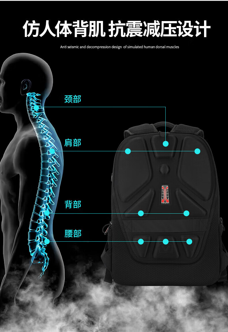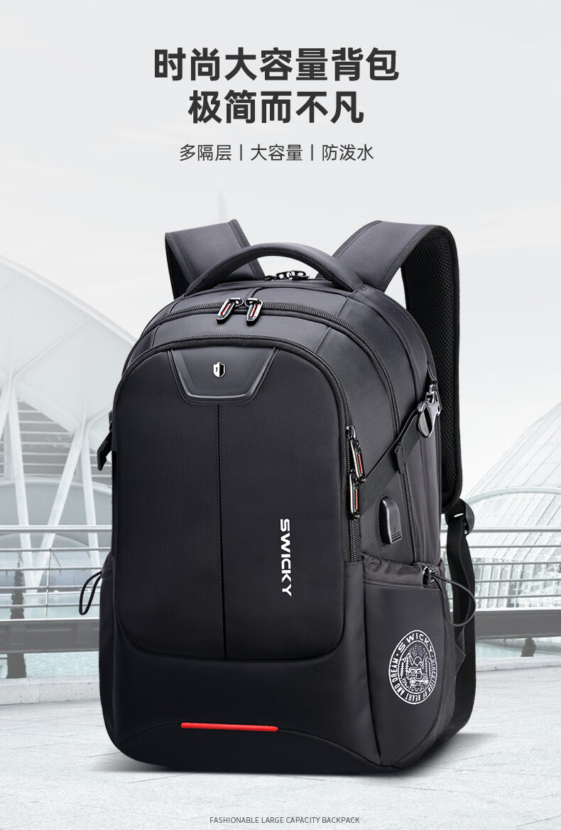 型号:81407盾牌款大号 尺寸:210*340*490(MM)大号材质:聚酯纤维颜色:黑色 重量:1KG 2.采用光治皮膜材料防泼水;3.超大容量设计可放15寸电脑;4.外置USB接口可直接连接手机充电;5.主袋内加厚电脑隔层;6.弹力蜂窝背板、透气、缓压、减震;
