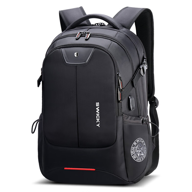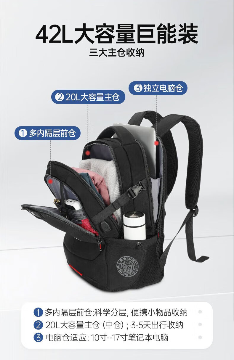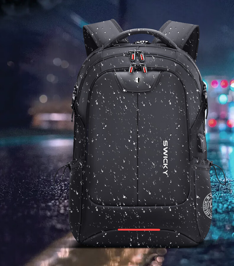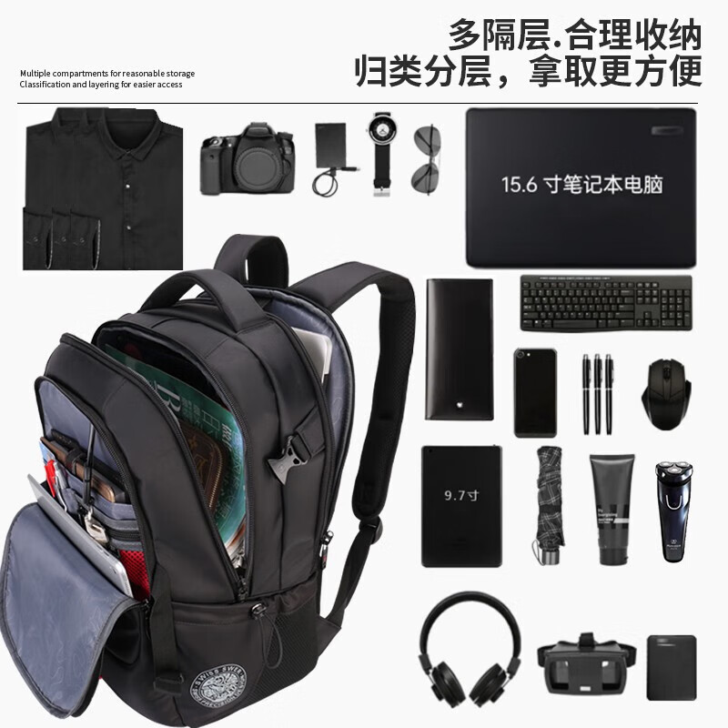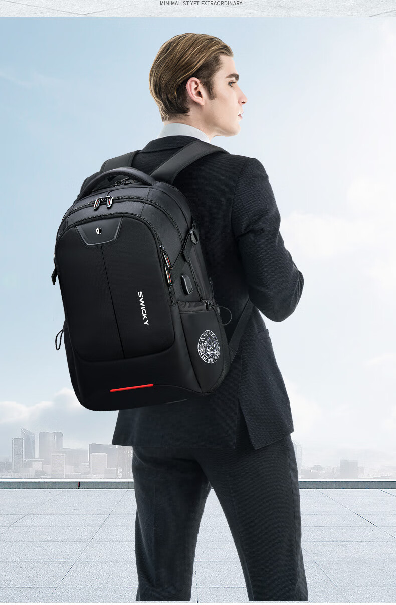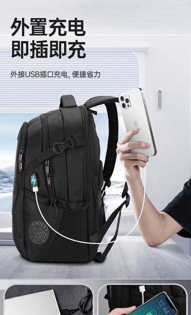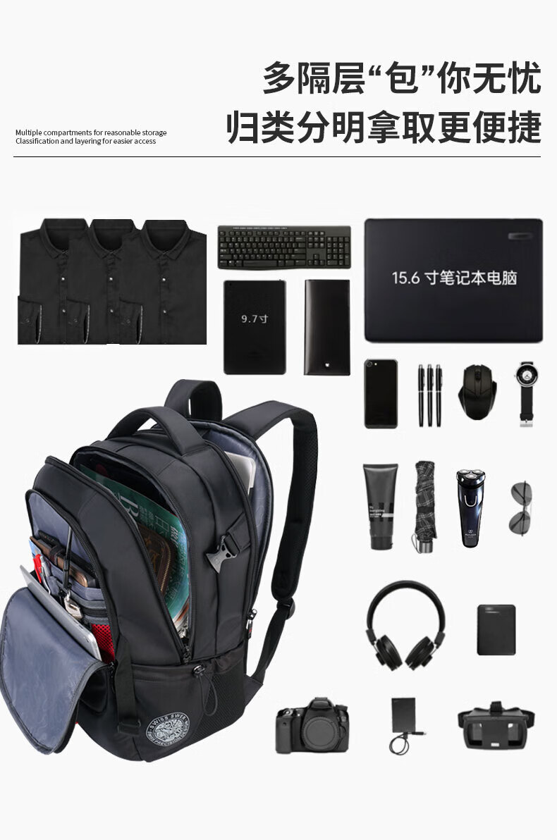 型号:81407盾牌款大号 尺寸:210*340*490(MM)大号材质:聚酯纤维颜色:黑色 重量:1KG 2.采用光治皮膜材料防泼水;3.超大容量设计可放15寸电脑;4.外置USB接口可直接连接手机充电;5.主袋内加厚电脑隔层;6.弹力蜂窝背板、透气、缓压、减震;