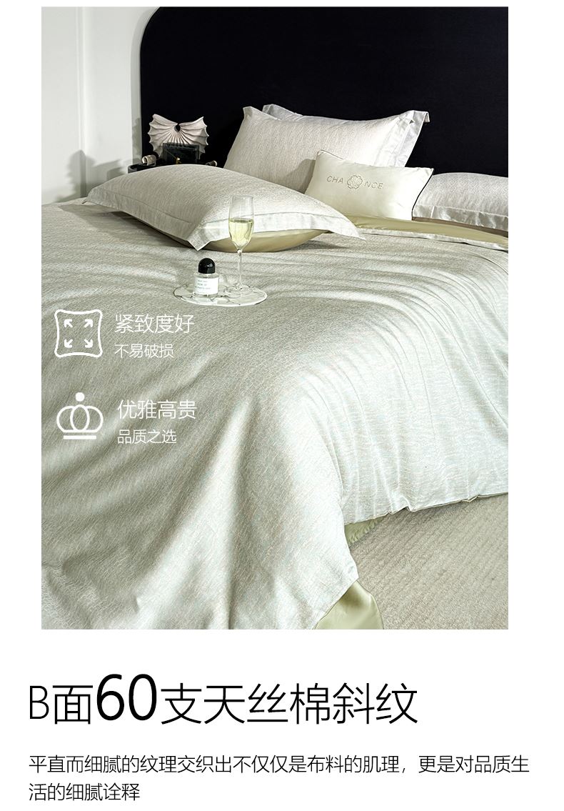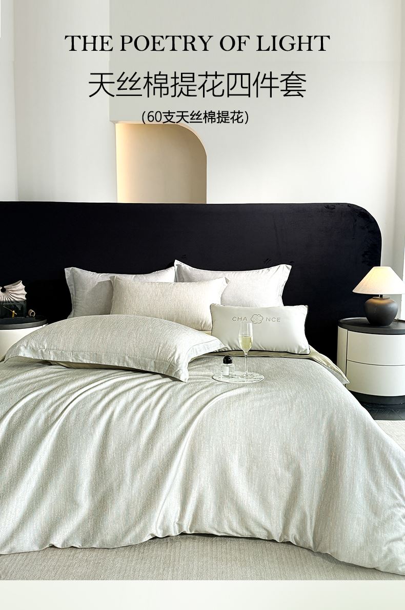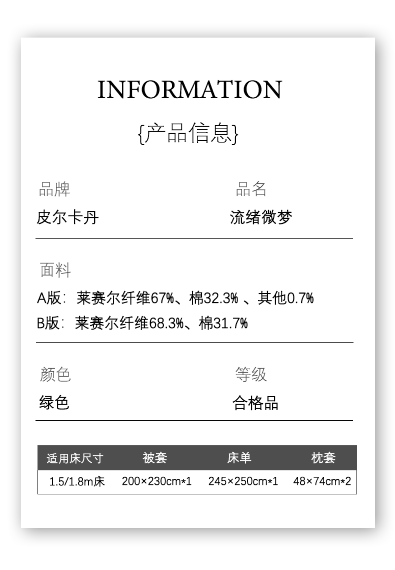 产品参数: 面料:A版:60支天丝棉提花 B版:60支天丝棉 工艺:提花+亮丝面料 规格: 被套200*230cm 床单245*250cm 枕套48*74cm*2只 产品等级:合格品 产品卖点: 采用天丝棉面料。A版采用独特的天丝棉提花+亮丝镶嵌,更显大气。