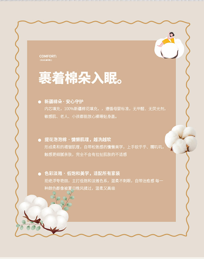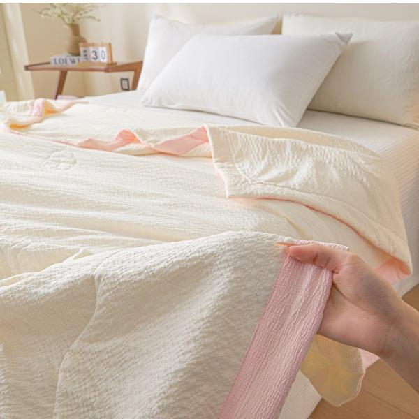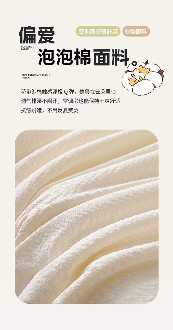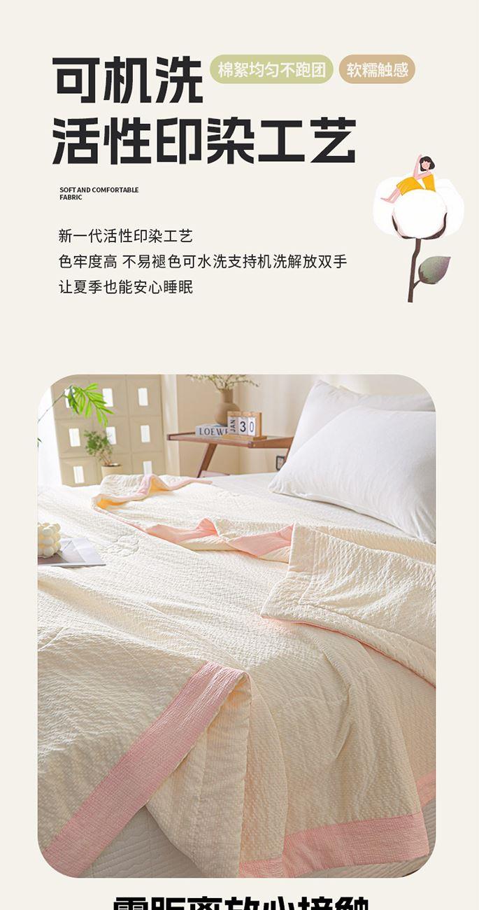 尺寸:200*230cm 面料:泡泡棉 填充:新疆棉花 执行标准:GB/T22796-2021 安全类别:GB18401-2010 B类 1.泡泡棉面料,亲肤透气,千爽透气贴着身体,仿佛会呼吸,越睡越上瘾。 2.软软糯糯很亲肤,织造紧密,手感柔软 3.非湿排热内芯,不再闷湿燥热,我们的水洗棉夏被,内部形成多孔的中空结构,加速排出湿气和热量。