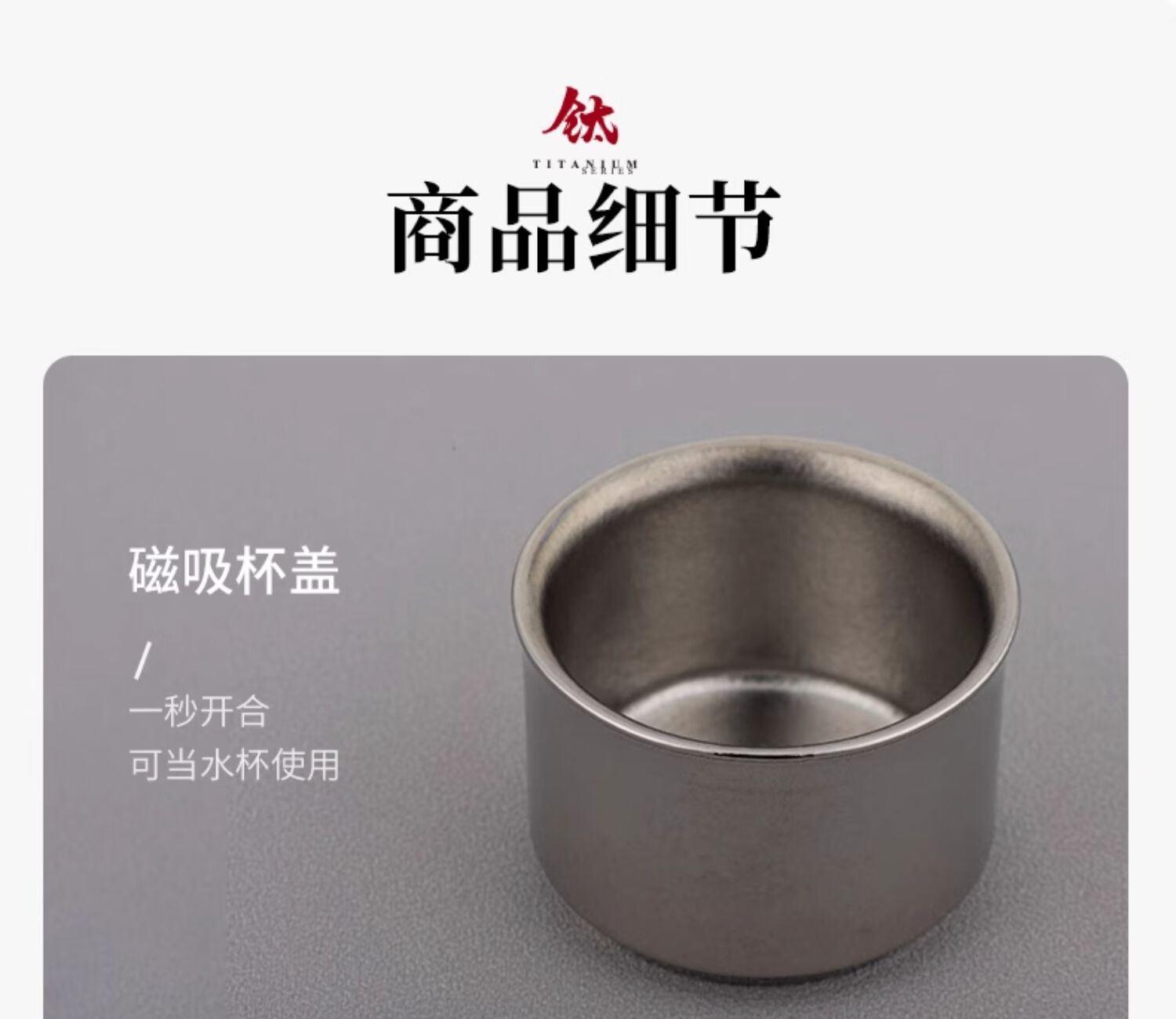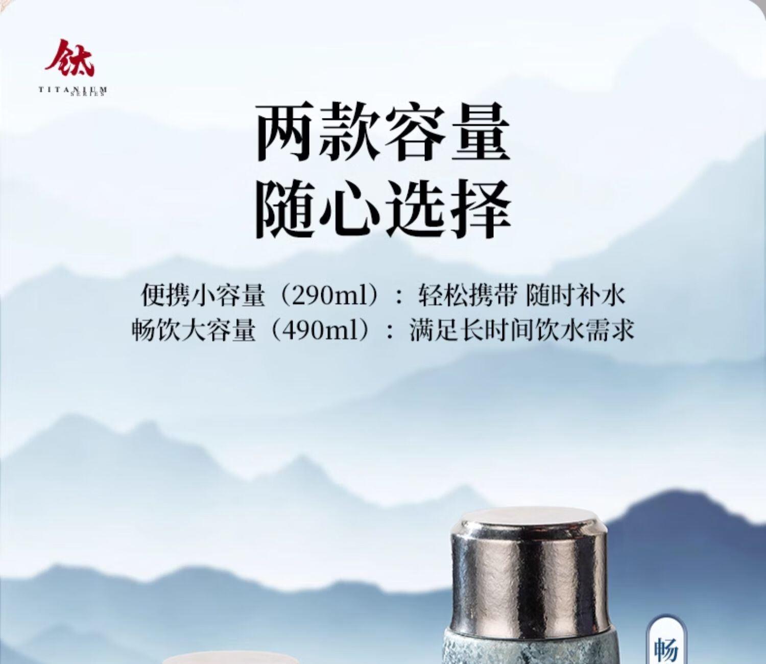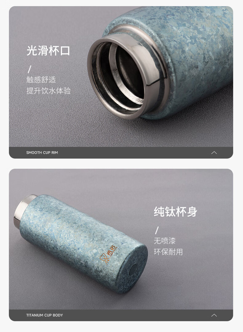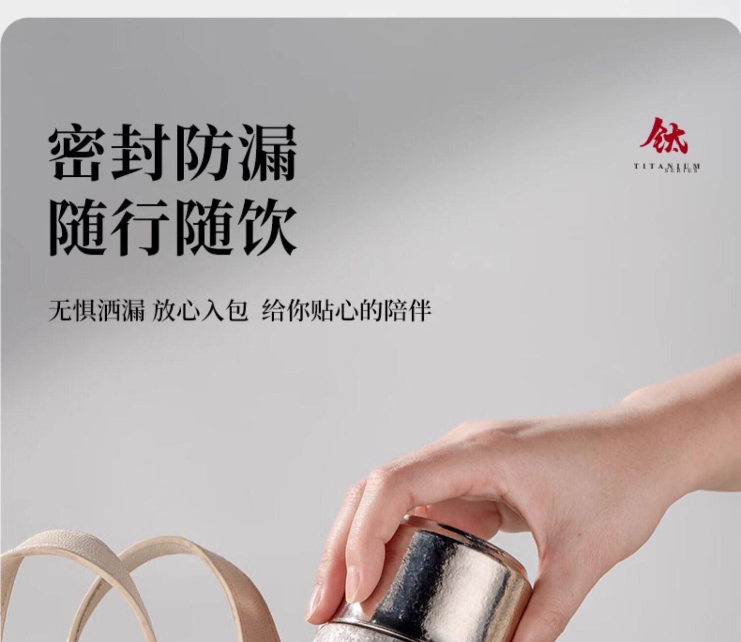 材质: 内胆-钛/杯身-钛 颜色:银月白/远天蓝/烟墨灰/云海 雾凇/东方朝霞 附加组件:手提袋 杯盖样式:双层旋盖+磁吸盖 容量:290ml