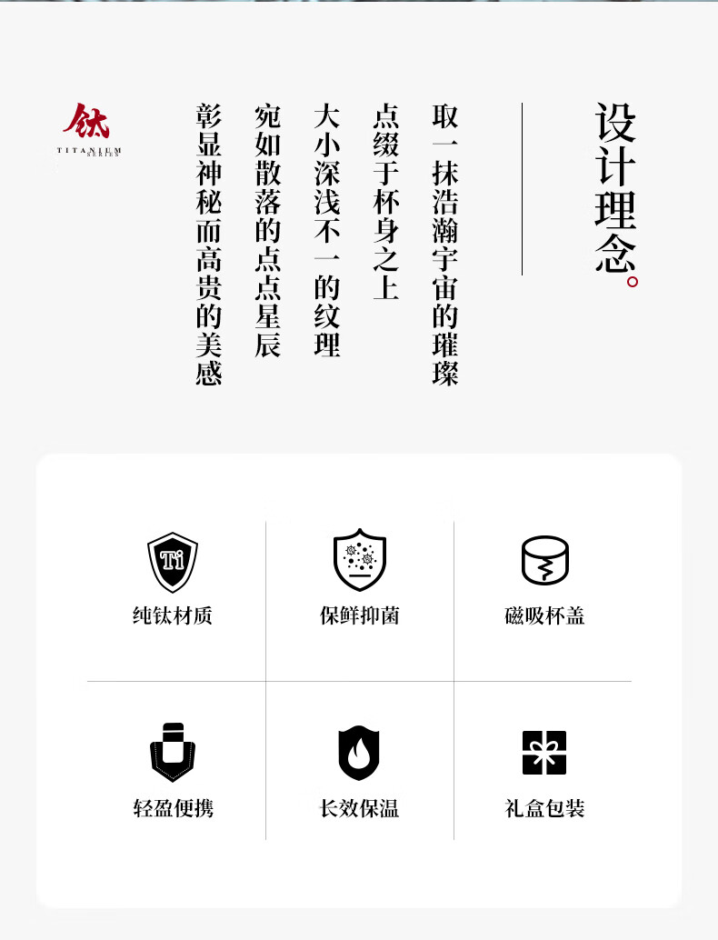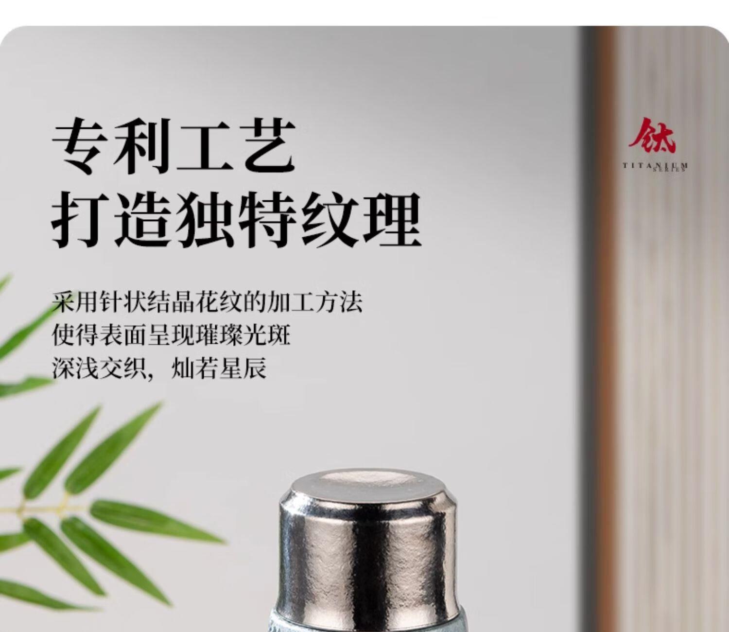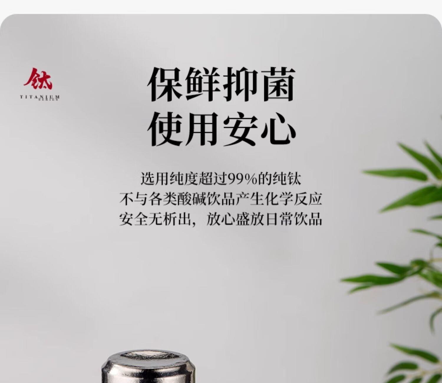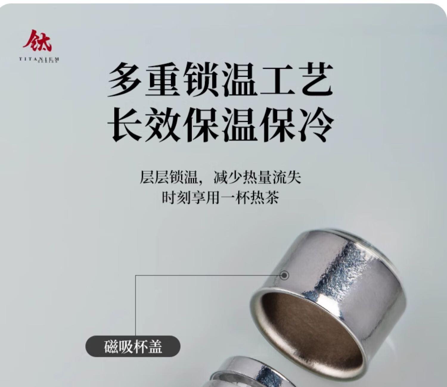 材质: 内胆-钛/杯身-钛 颜色:银月白/远天蓝/烟墨灰/云海 雾凇/东方朝霞 附加组件:手提袋 杯盖样式:双层旋盖+磁吸盖 容量:290ml
