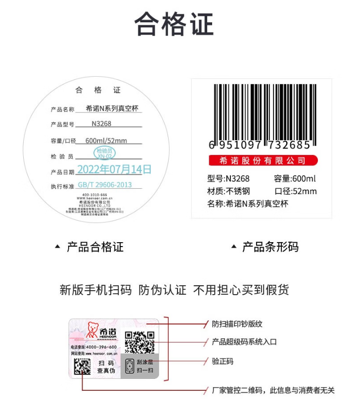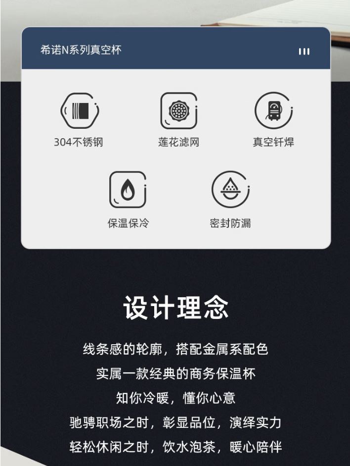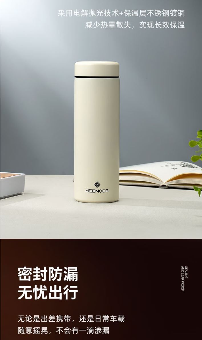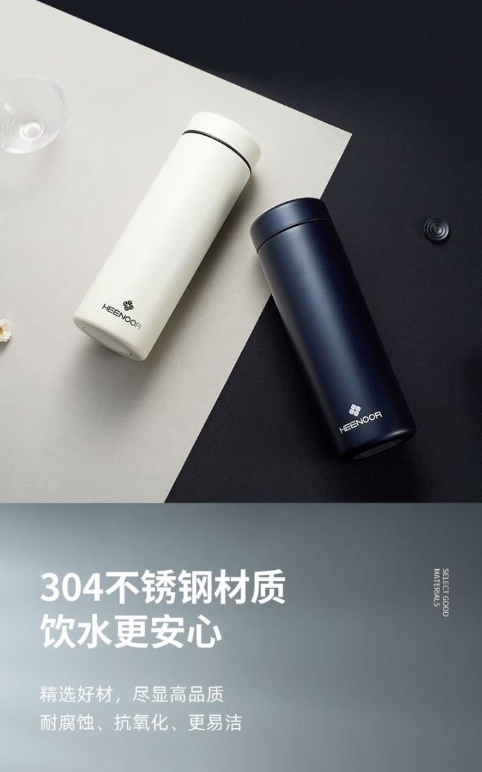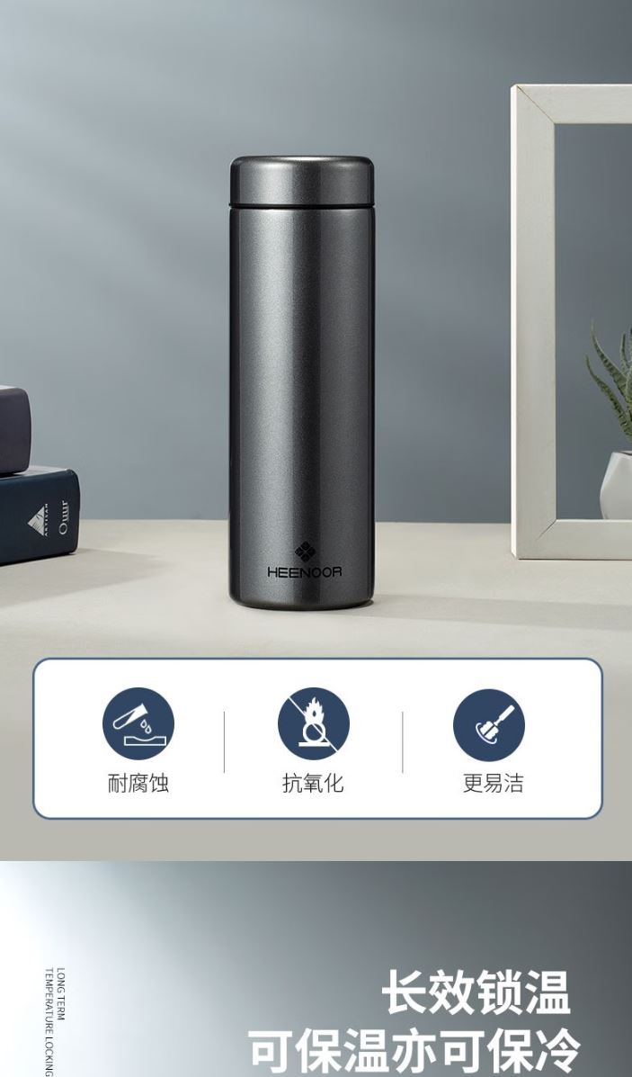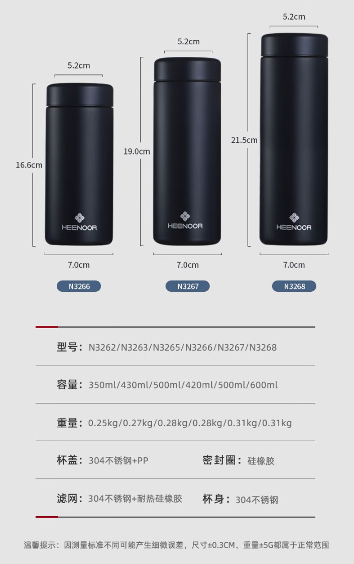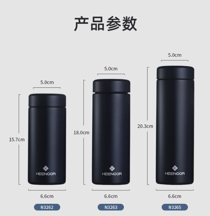 容量 精品N3263:430ml 规格(mm) 精品N3263:50(杯口直径) x 66(直径) x180(高度) 杯体 304不锈钢 杯盖 进口食品级PP、304不锈钢 密封圈 进口食品级硅胶 重量 精品N3263:0.25kg 颜色 藏蓝、烟灰、本色、米白