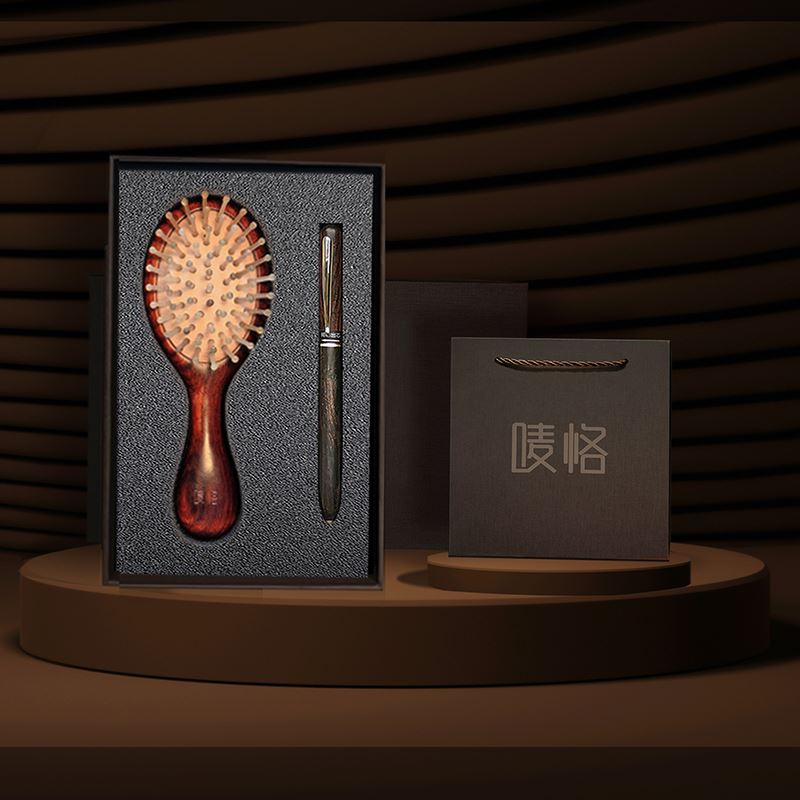 主要材质:檀木、山羊角 木水笔尺寸:11*136MM 气垫梳尺寸:160*60MM(宽处) 包装尺寸:195*130*48MM