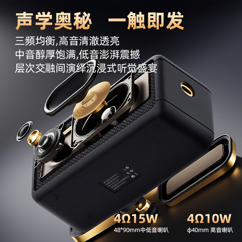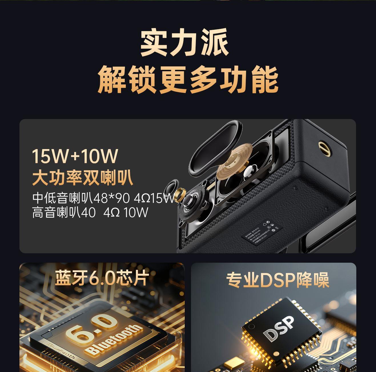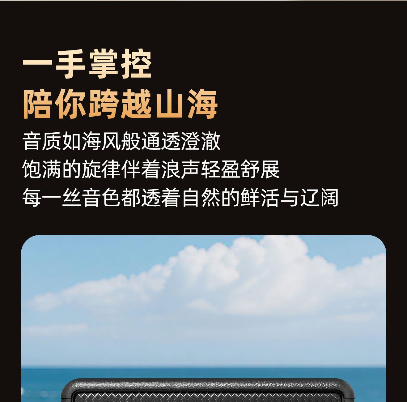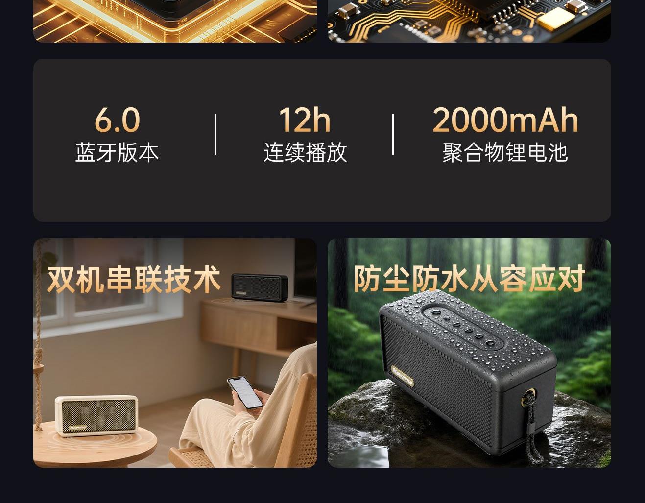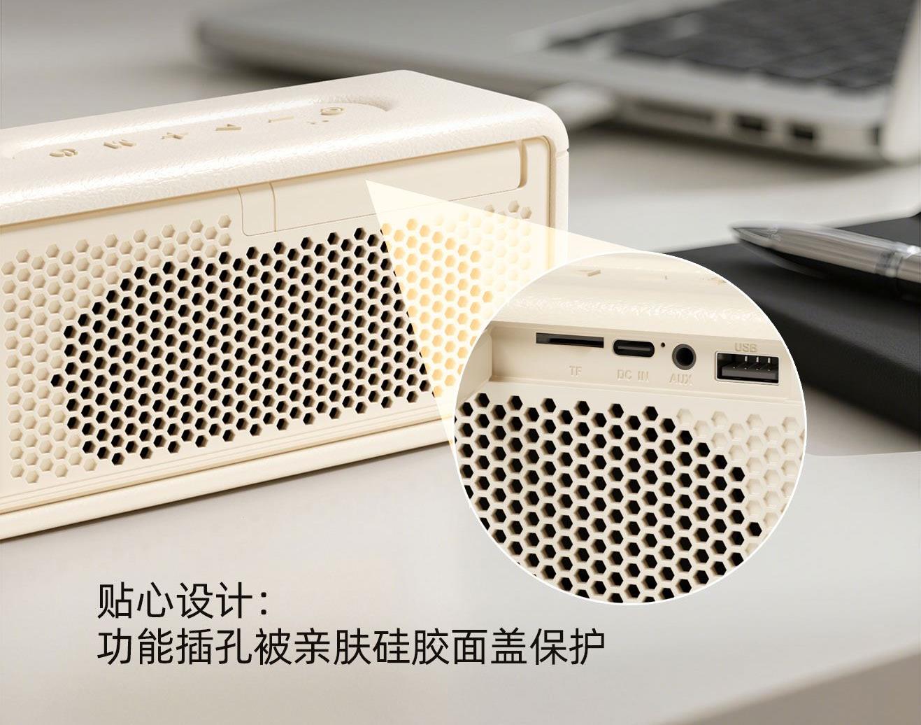 蓝牙版本 :V6.0 传输半径 :10米 电池容量 :2000mAh 使用时间 :约12H 充电时间 :约2H 颜色 :黑色/米色 功能支持 :蓝牙/TF卡/USB/AUX音频线/收音机 产品尺寸 :174mm*84mm*70mm . 大尺寸金属复合振膜,全景环绕音效 · 高速蓝牙6.0,连接快,兼容更广泛,抗干扰,低延迟,低功耗 · 大容量强劲续航,一次充电可连续听音乐12小时 · 内置高清降噪收音麦,接听电话,过滤环境杂音,收音灵敏 · 按键清晰,凹凸设计。按键设于音箱底部,结合防滑垫 · 生活防水,防雨防汗,可边运动边享受音乐 . 轻量化机身,运动随心所欲 . 支持TWS互联功能,两台共享声音,双倍环绕立体声