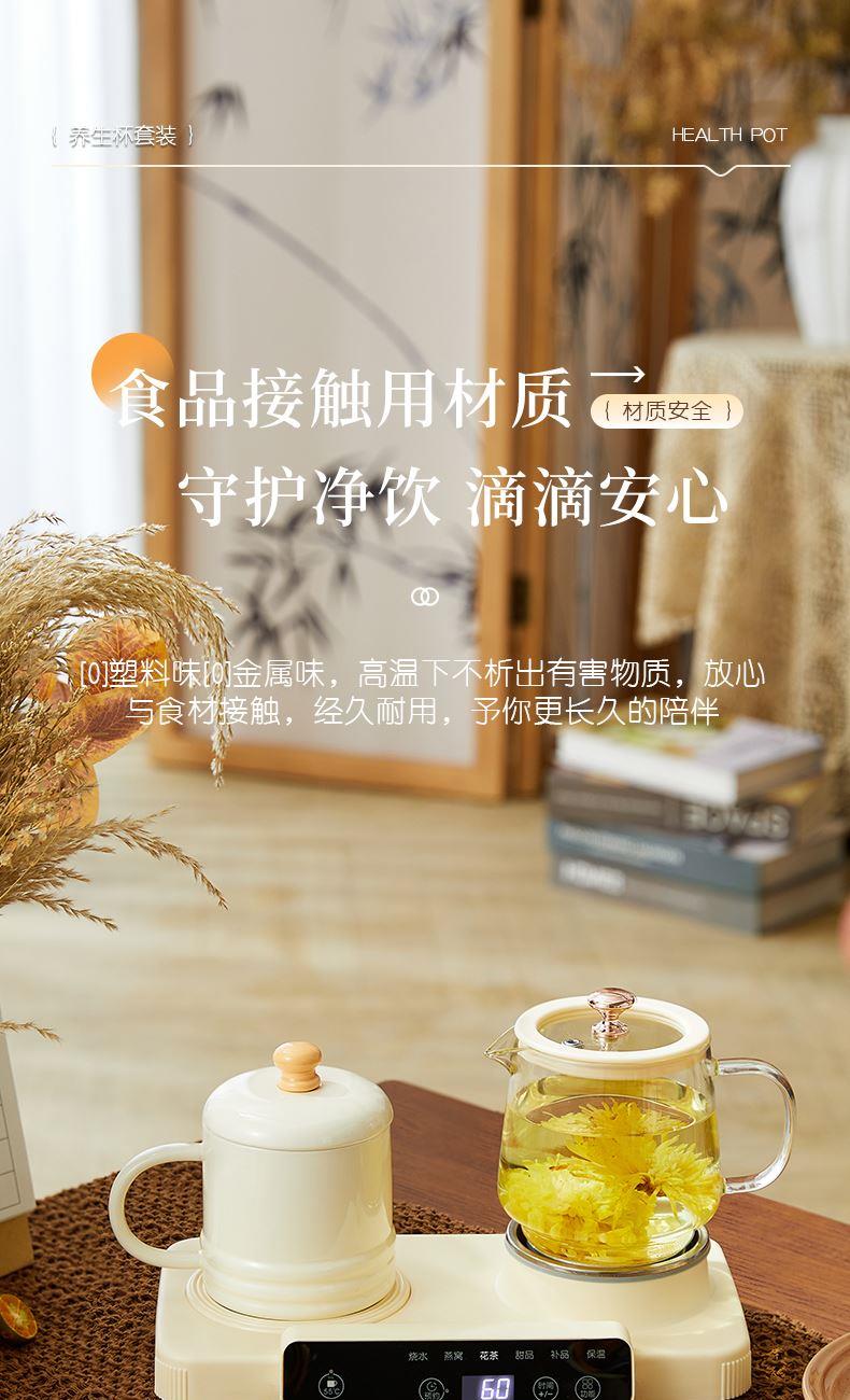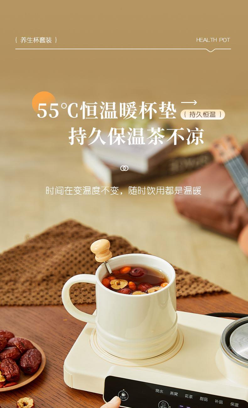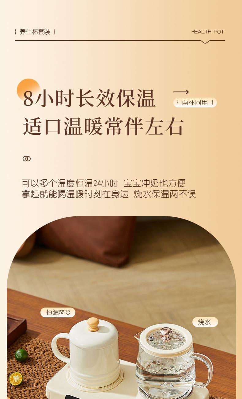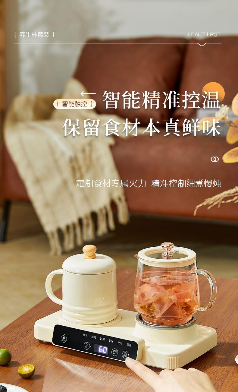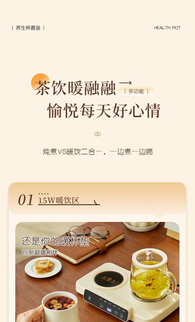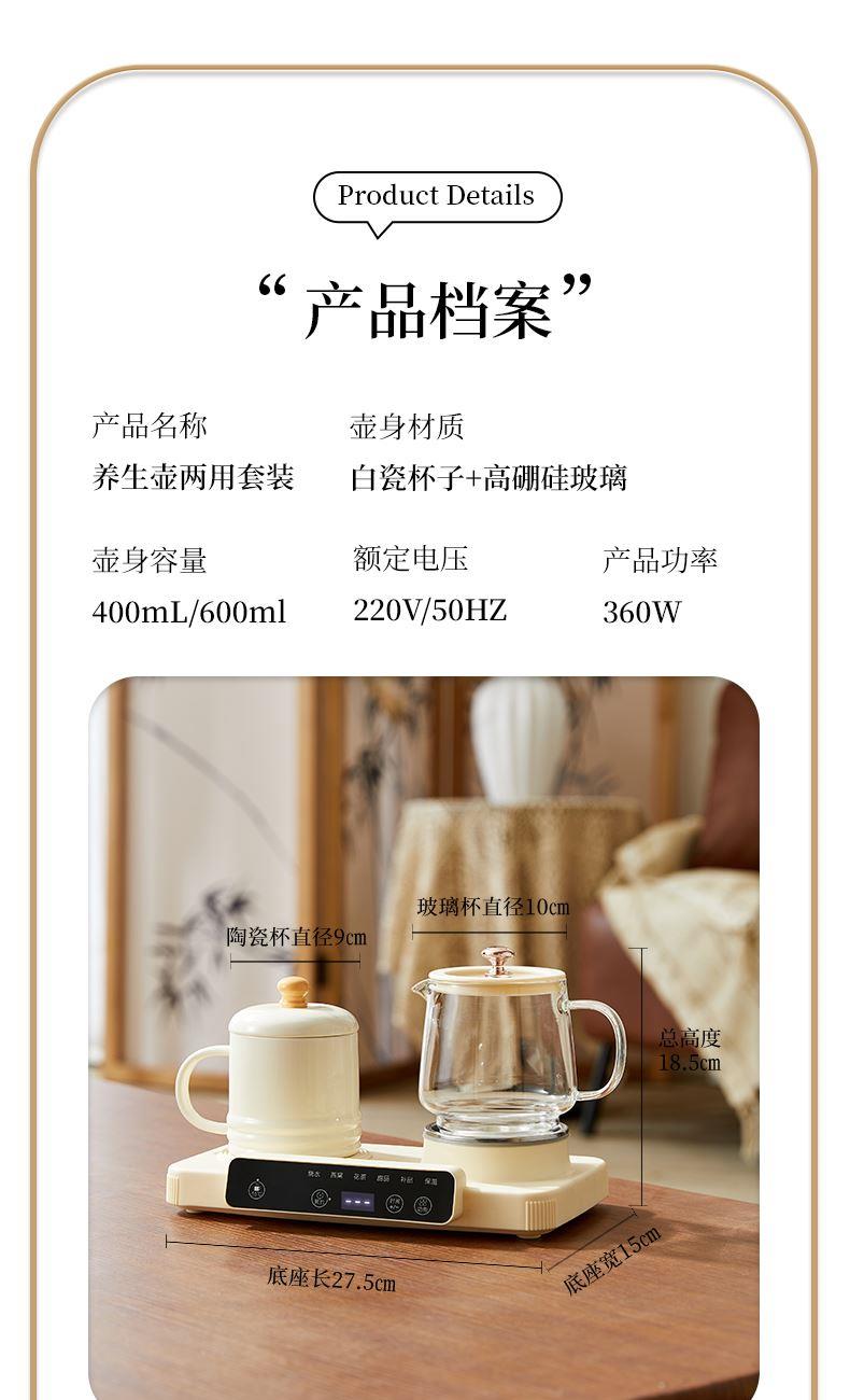 额定功率:15W+360W 颜色:奶油白 主机容量:400ML+600ML 规格:二合一养生壶套装 产品款式:微电脑轻触操作 包装清单:白瓷杯+高硼硅玻璃壶+勺子+底座 包装:彩盒包装 特色功能 1、双底座养生壶炖煮二合一,左边保温,右边炖煮同享; 2、1壶1杯一套装,6大预设功能,15W暖饮,375W炖煮; 3、600ML炖煮养生杯+400ML恒温杯二合一; 4、分体式养生壶杯壶,清洗方便,提壶即饮; 5、高硼硅玻璃壶+白瓷饮水杯,高温防干烧自动断电; 6、自动断电,防干烧功能;一机多用,可用于婴儿暖奶及保温;