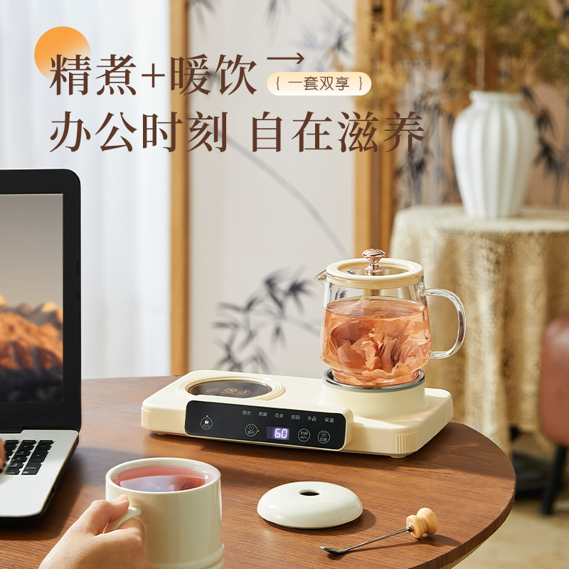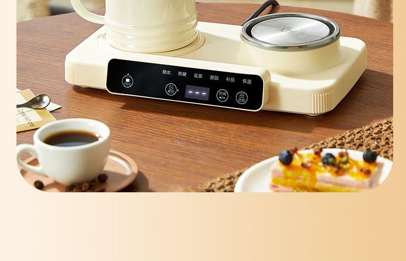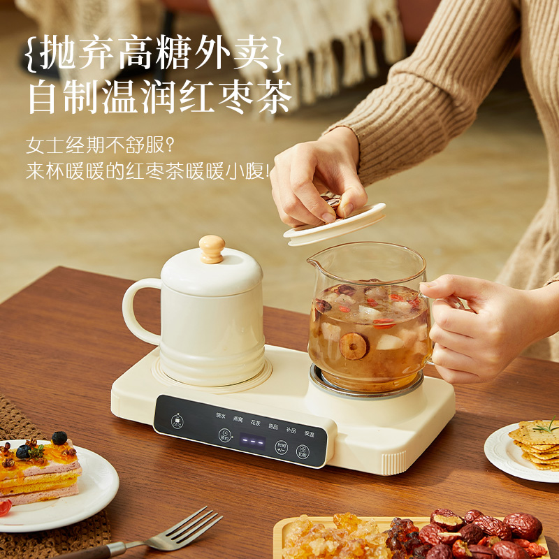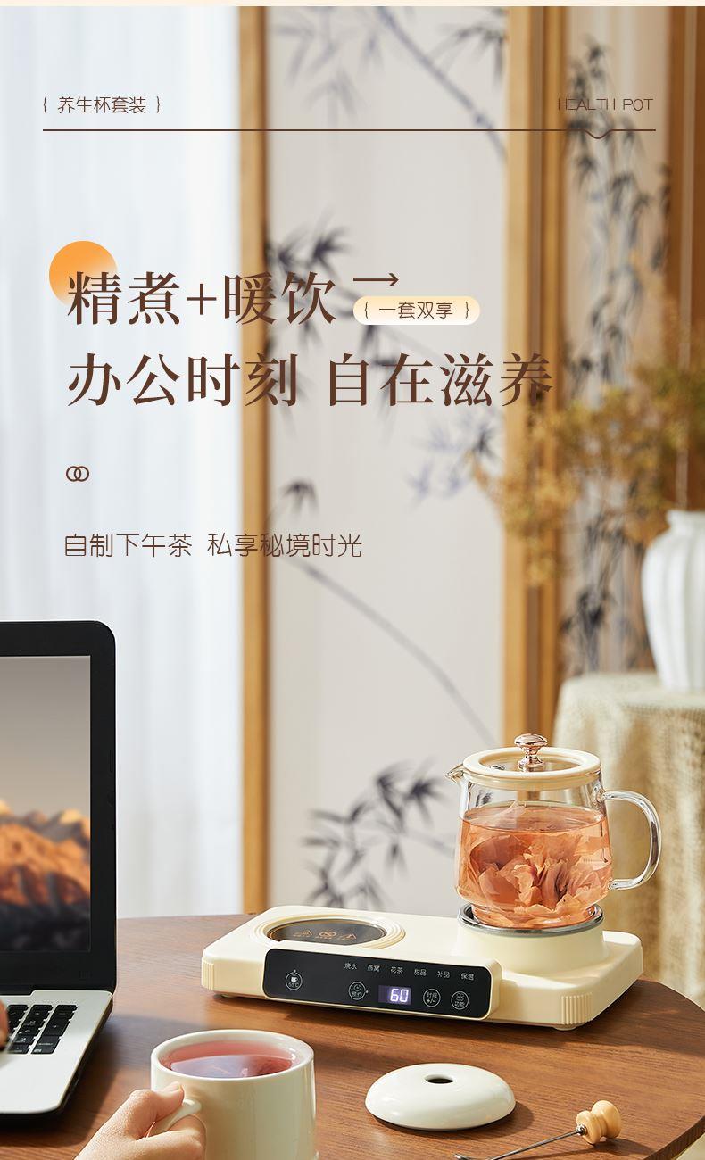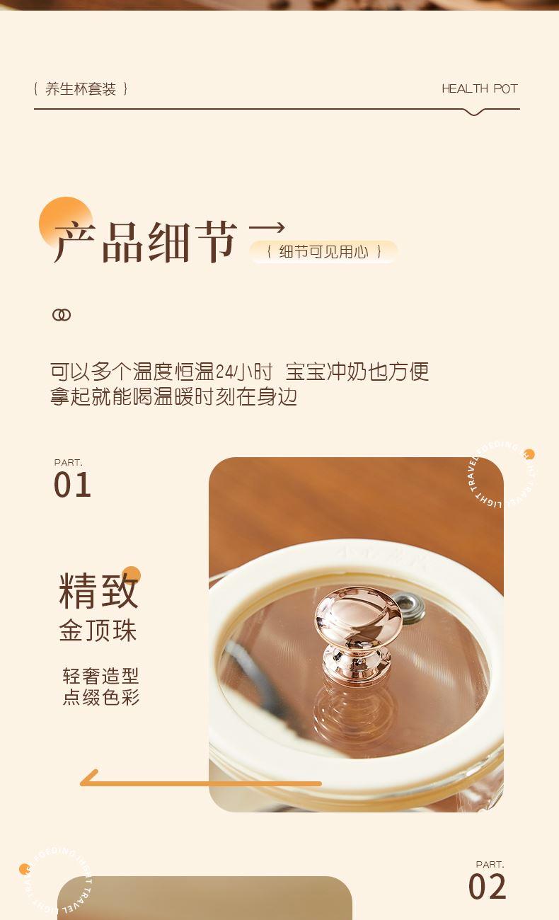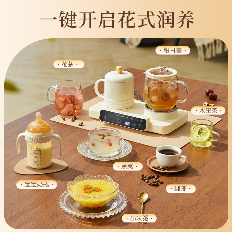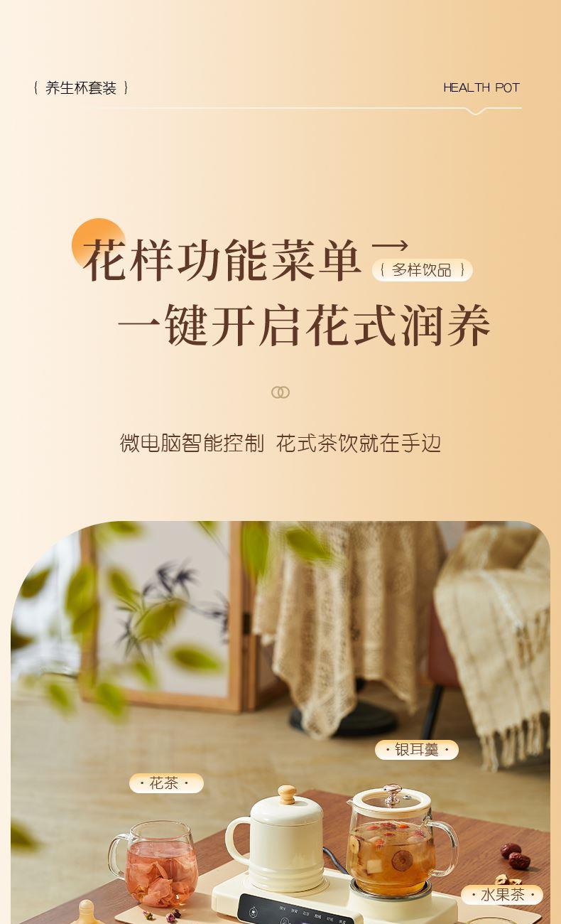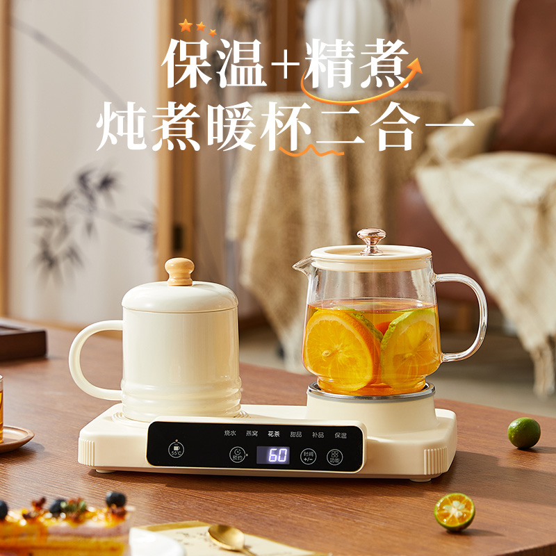 额定功率:15W+360W 颜色:奶油白 主机容量:400ML+600ML 规格:二合一养生壶套装 产品款式:微电脑轻触操作 包装清单:白瓷杯+高硼硅玻璃壶+勺子+底座 包装:彩盒包装 特色功能 1、双底座养生壶炖煮二合一,左边保温,右边炖煮同享; 2、1壶1杯一套装,6大预设功能,15W暖饮,375W炖煮; 3、600ML炖煮养生杯+400ML恒温杯二合一; 4、分体式养生壶杯壶,清洗方便,提壶即饮; 5、高硼硅玻璃壶+白瓷饮水杯,高温防干烧自动断电; 6、自动断电,防干烧功能;一机多用,可用于婴儿暖奶及保温;
