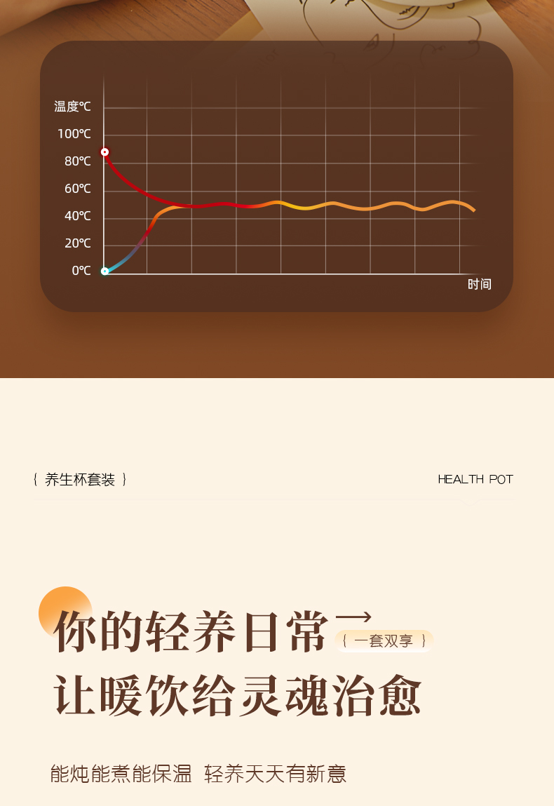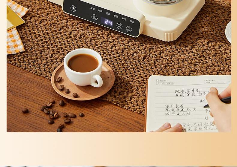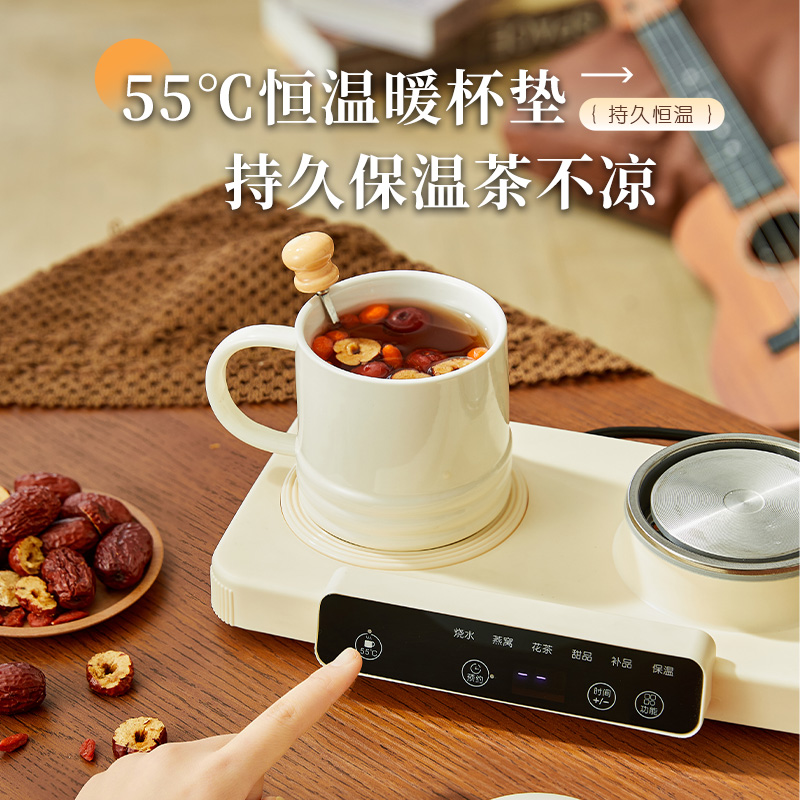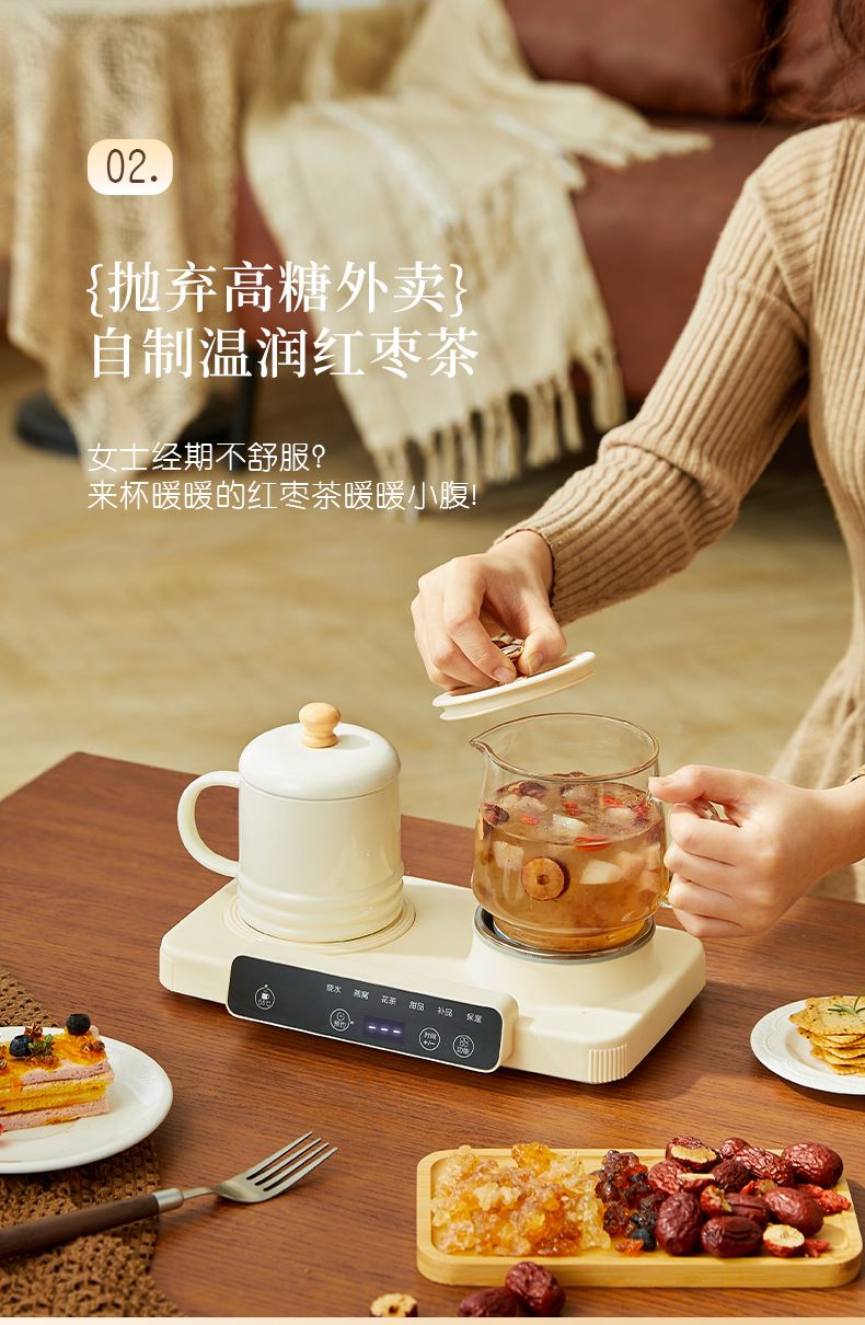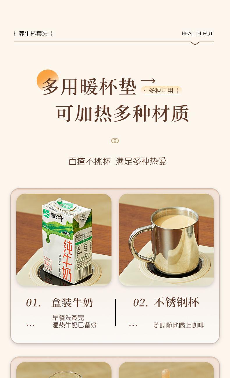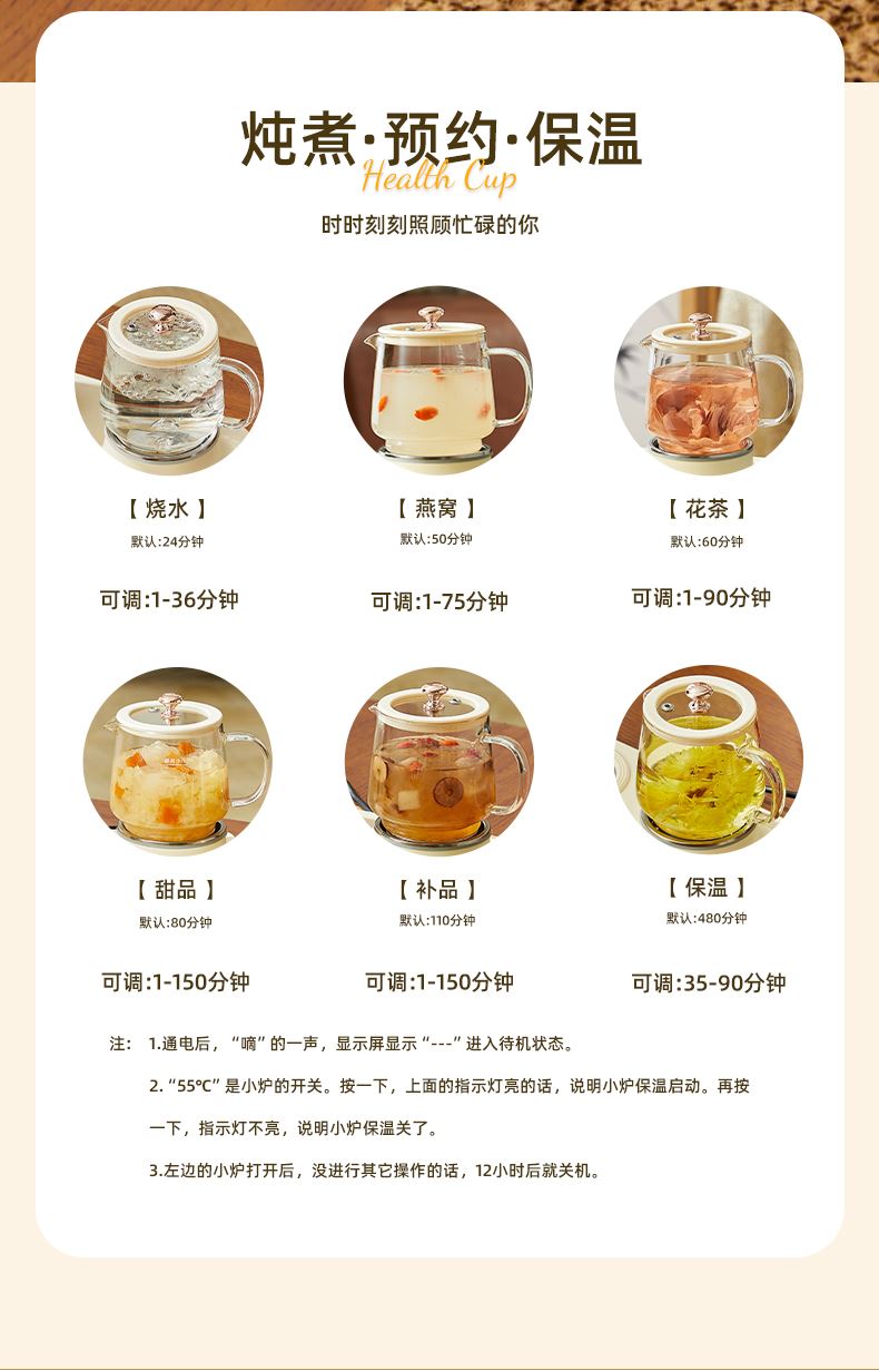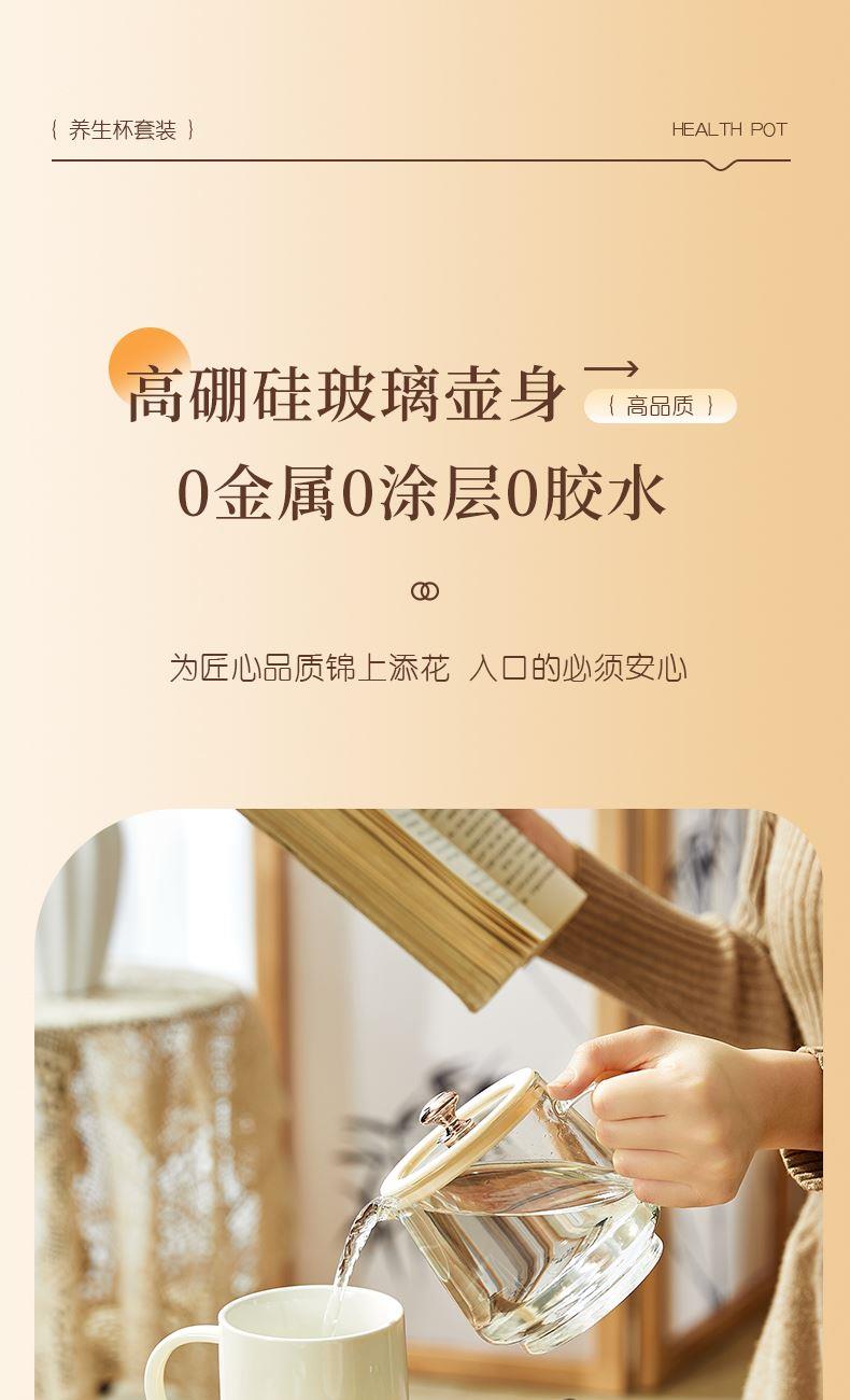 额定功率:15W+360W 颜色:奶油白 主机容量:400ML+600ML 规格:二合一养生壶套装 产品款式:微电脑轻触操作 包装清单:白瓷杯+高硼硅玻璃壶+勺子+底座 包装:彩盒包装 特色功能 1、双底座养生壶炖煮二合一,左边保温,右边炖煮同享; 2、1壶1杯一套装,6大预设功能,15W暖饮,375W炖煮; 3、600ML炖煮养生杯+400ML恒温杯二合一; 4、分体式养生壶杯壶,清洗方便,提壶即饮; 5、高硼硅玻璃壶+白瓷饮水杯,高温防干烧自动断电; 6、自动断电,防干烧功能;一机多用,可用于婴儿暖奶及保温;