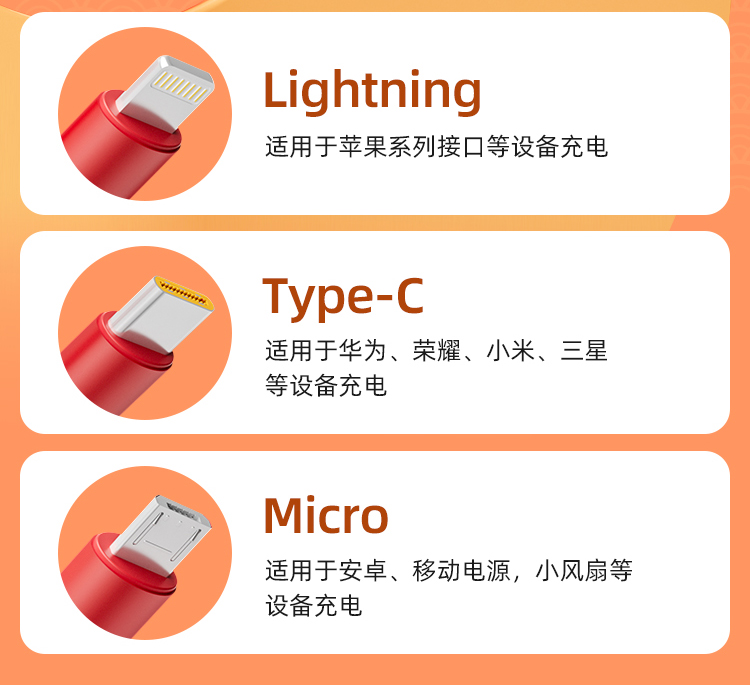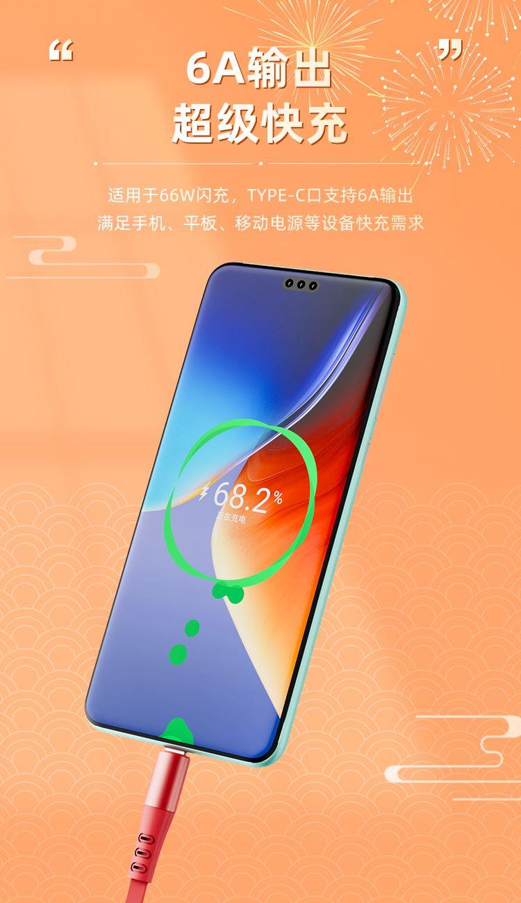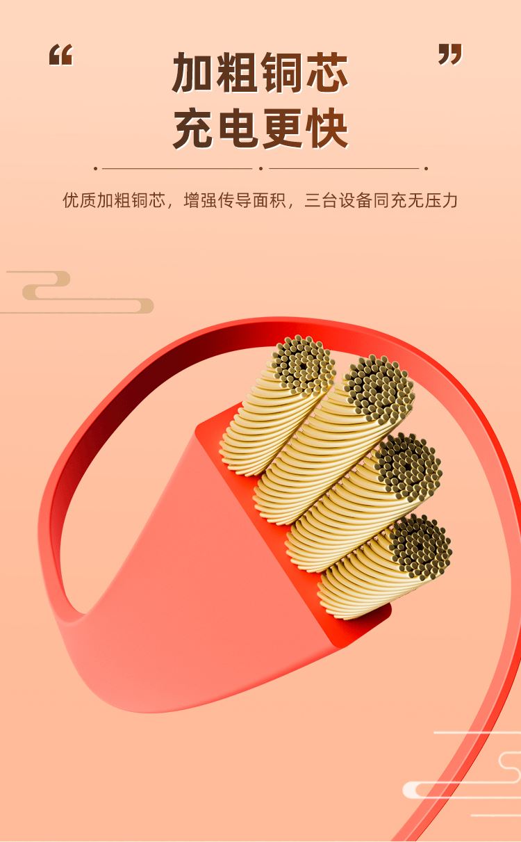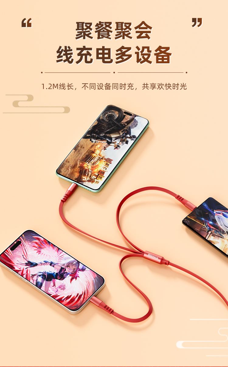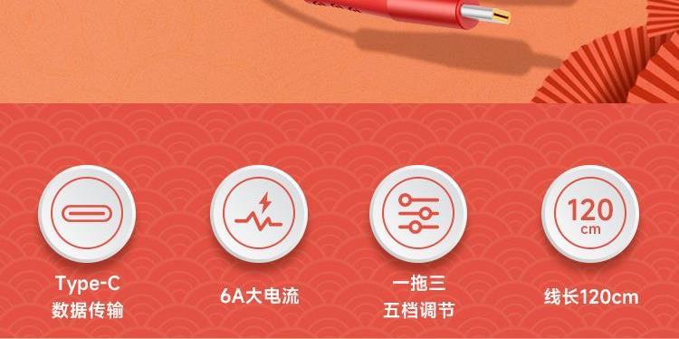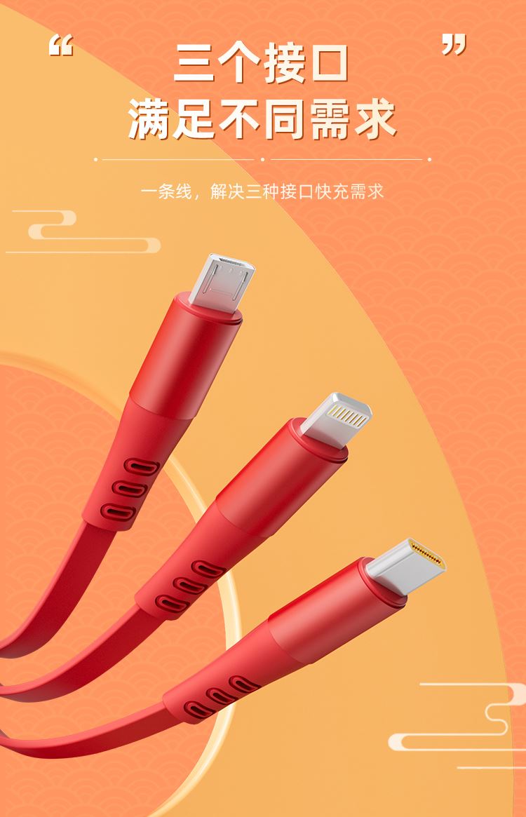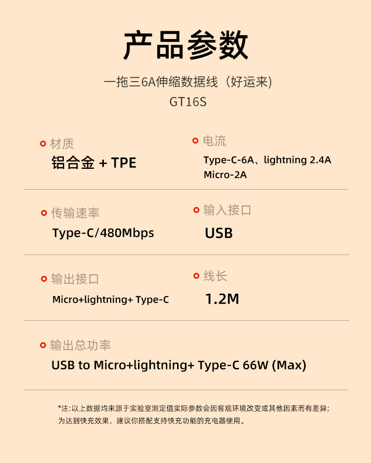 材质:铝合金+TPE 电流:Type-C-6A、lightning-2.4A. Micro-2A 传输速率:Type-C/480Mbps 输入接口:USB 输出接口:Micro+lightning+ Type-C 线长:1.2M 输出总功率:USB to Micro+lightning+ Type-C 66W (Max) 1:一线三充,三台设备同时充电 聚餐聚会同时充电,不用等待 2:适用于66W闪充,TYPE-C口支持6A输出 满足手机、平板、移动电源等设备快充需求 3:高弹力、升级TPE线、强悍耐磨折不断 4:材质升级、舒适更耐用、耐用更有高颜值 5:五个档位、调节想要的长度、30-120cm,随意调节,以一敌三